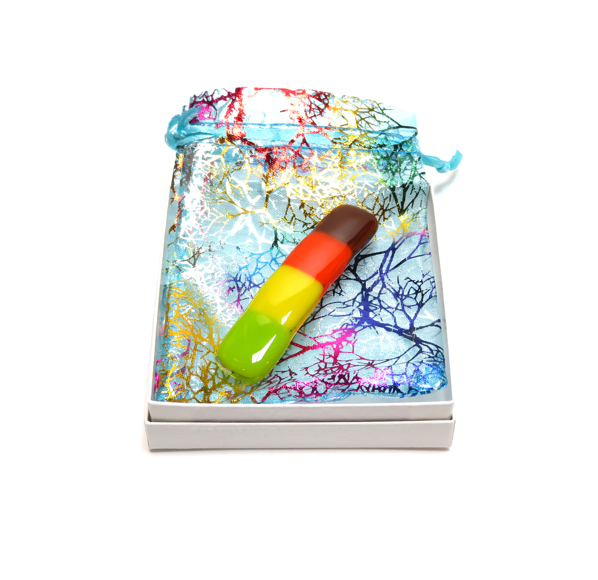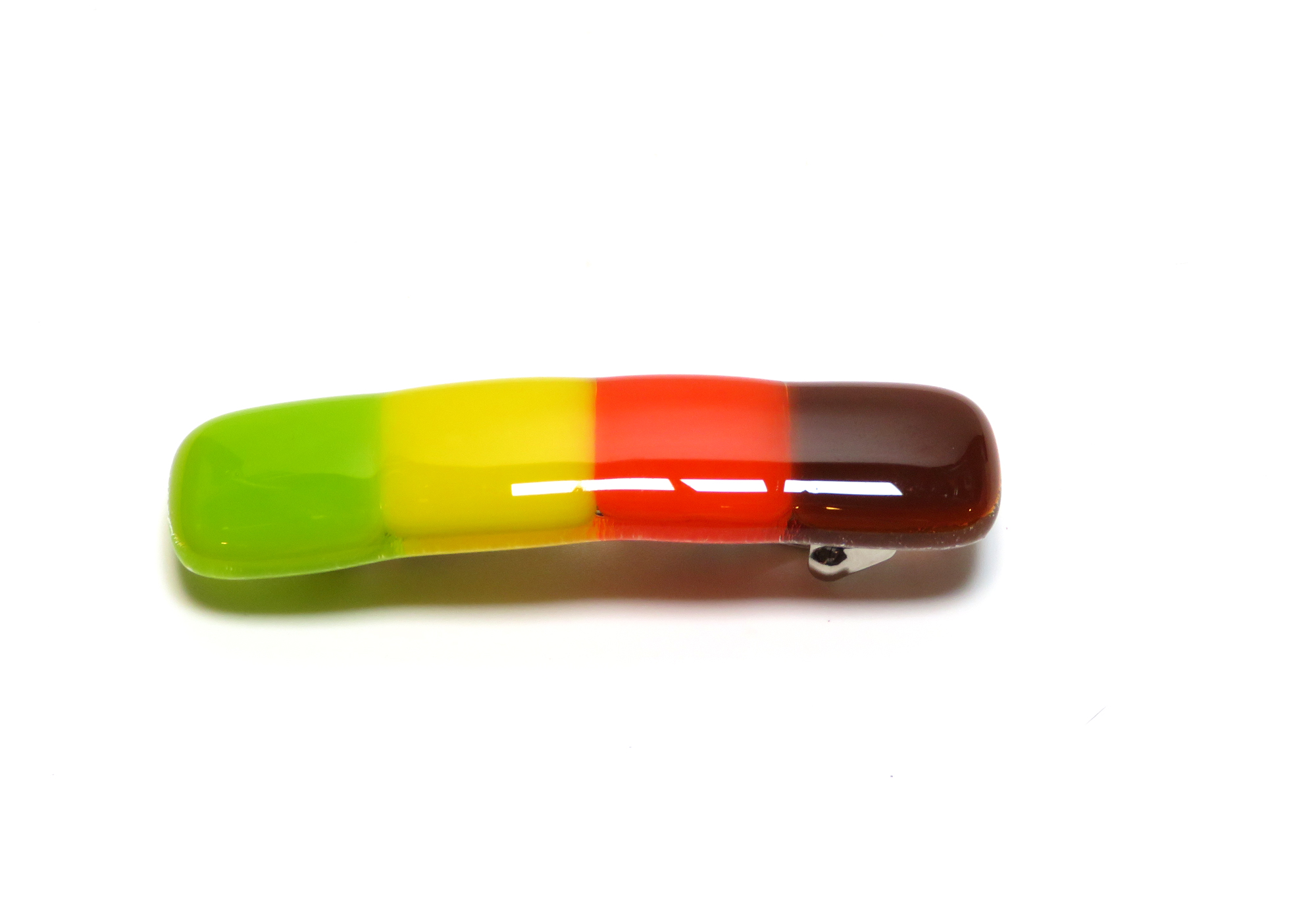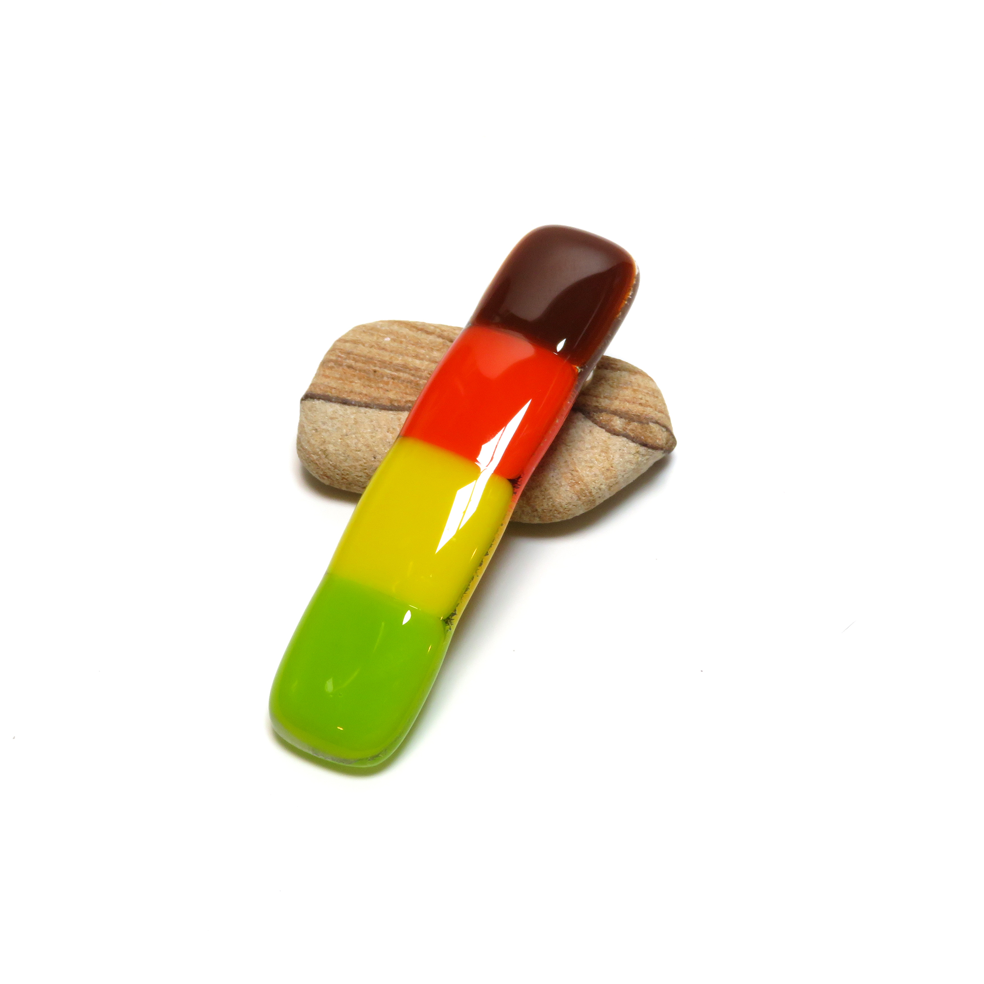 Celebrate the warmth of autumn with this handcrafted fused glass barrette, featuring rich layers of brown, red, yellow, and green glass that capture the essence of changing leaves and cozy fall days. Each piece is kiln-fired for 8+ hours, giving it a smooth, glossy finish and lasting strength — ideal for those with fine or delicate hair.