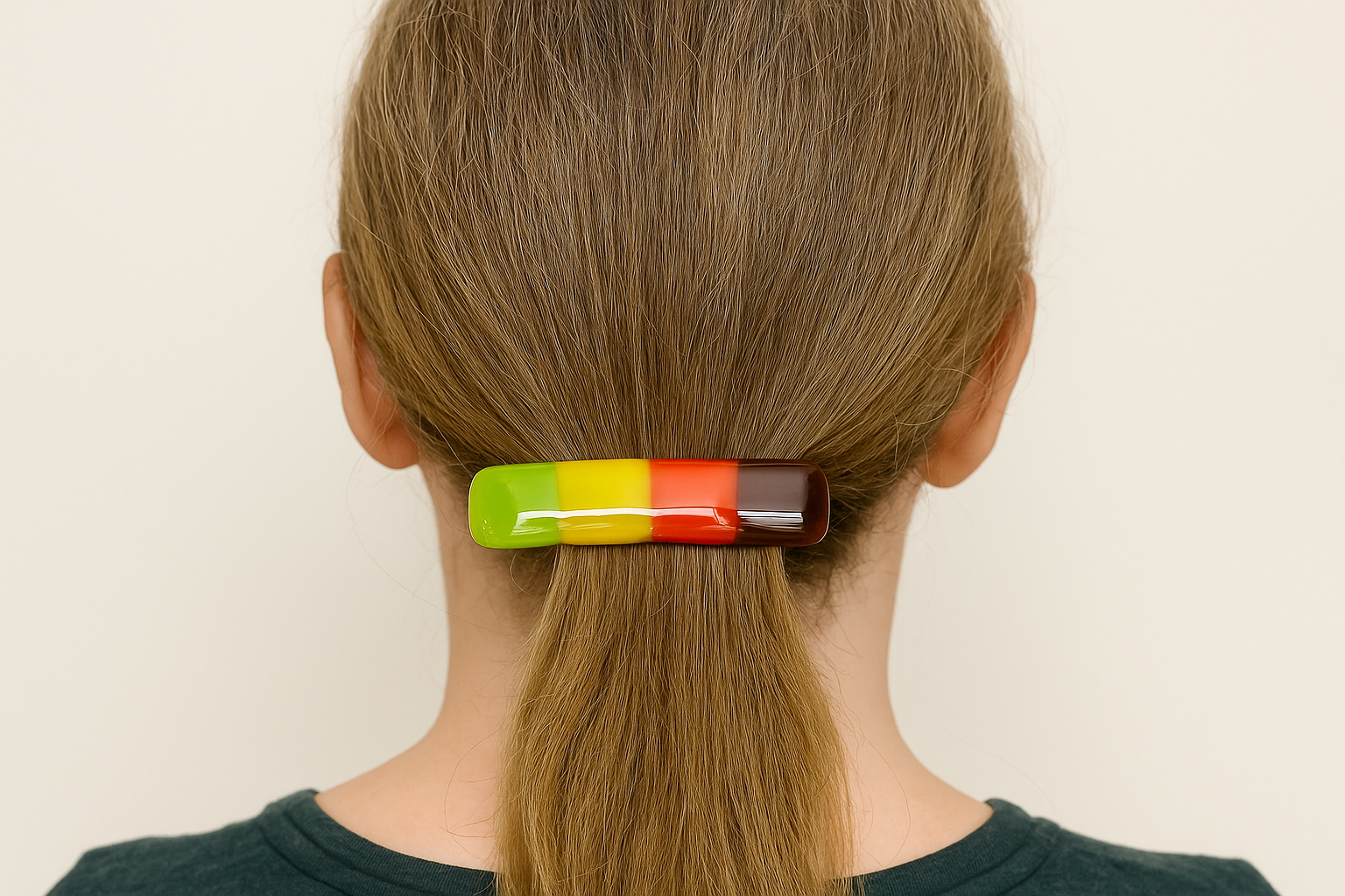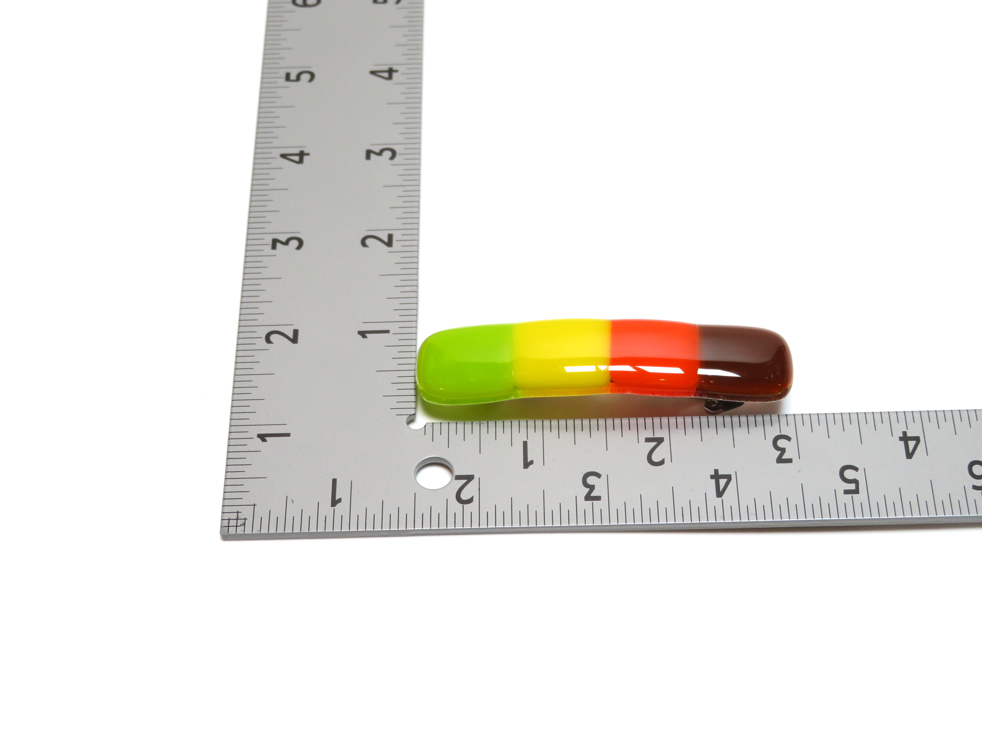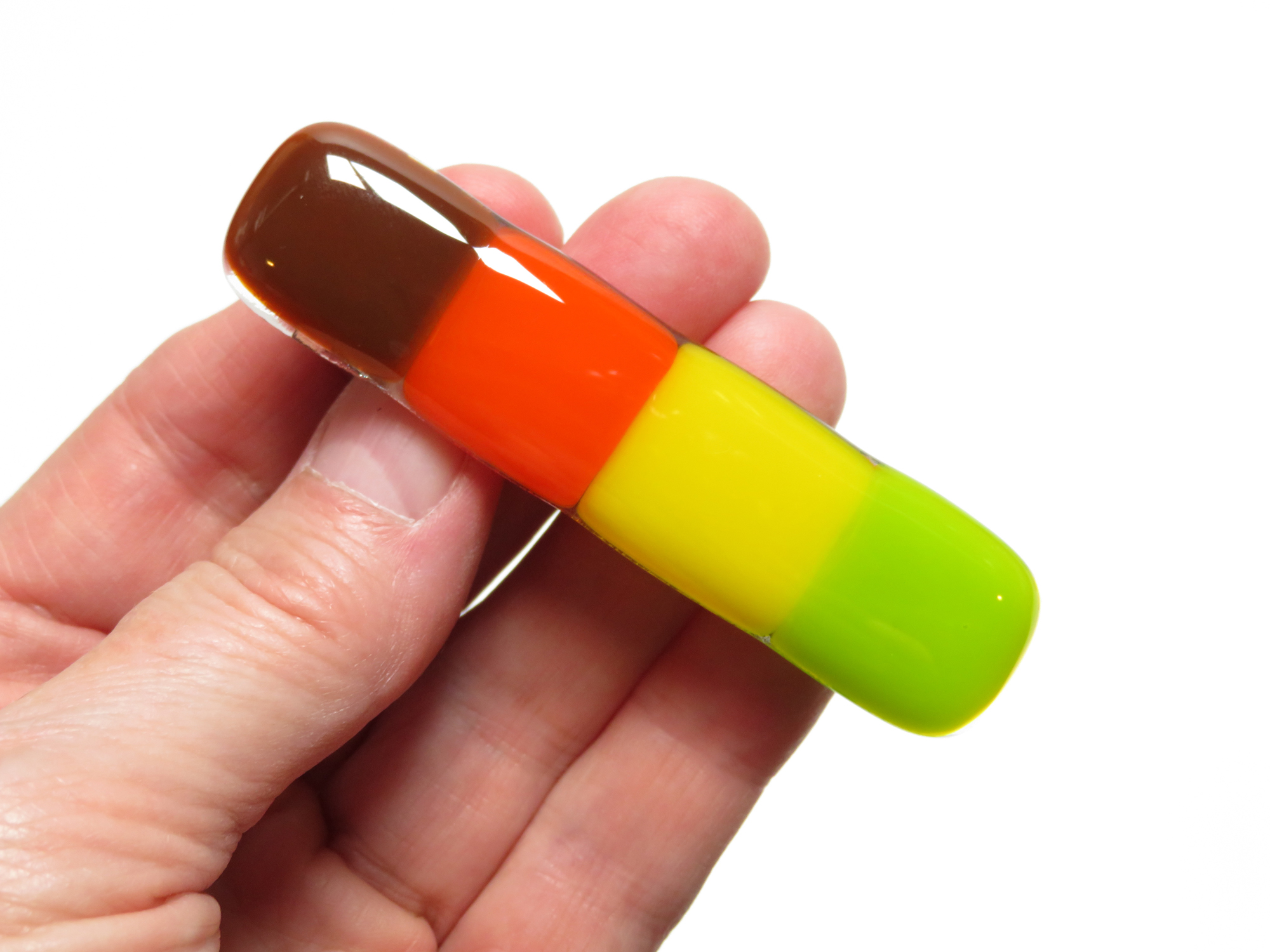 Celebrate the warmth of autumn with this handcrafted fused glass barrette, featuring rich layers of brown, red, yellow, and green glass that capture the essence of changing leaves and cozy fall days. Each piece is kiln-fired for 8+ hours, giving it a smooth, glossy finish and lasting strength — ideal for those with fine or delicate hair.