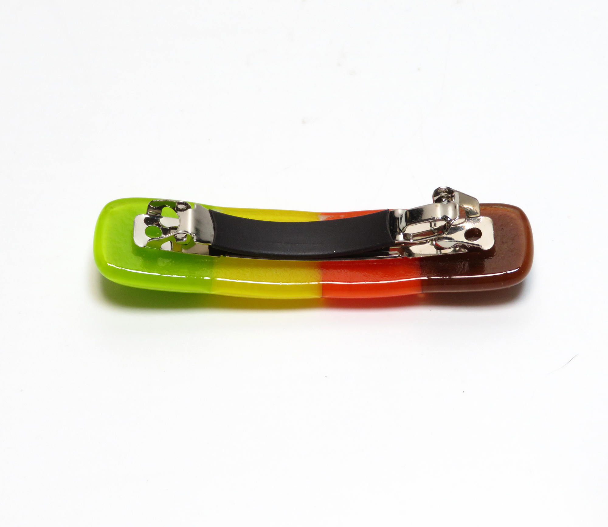 All pieces are original designs and carefully hand-cut, arranged, and fired in my kiln. Once fired, the edges of the barrette are cleaned up and returned to the kiln for a second firing to smooth out the edges and bring a final luster to the barrette. Finally, a French-style barrette clip is glued to the back of the barrette.