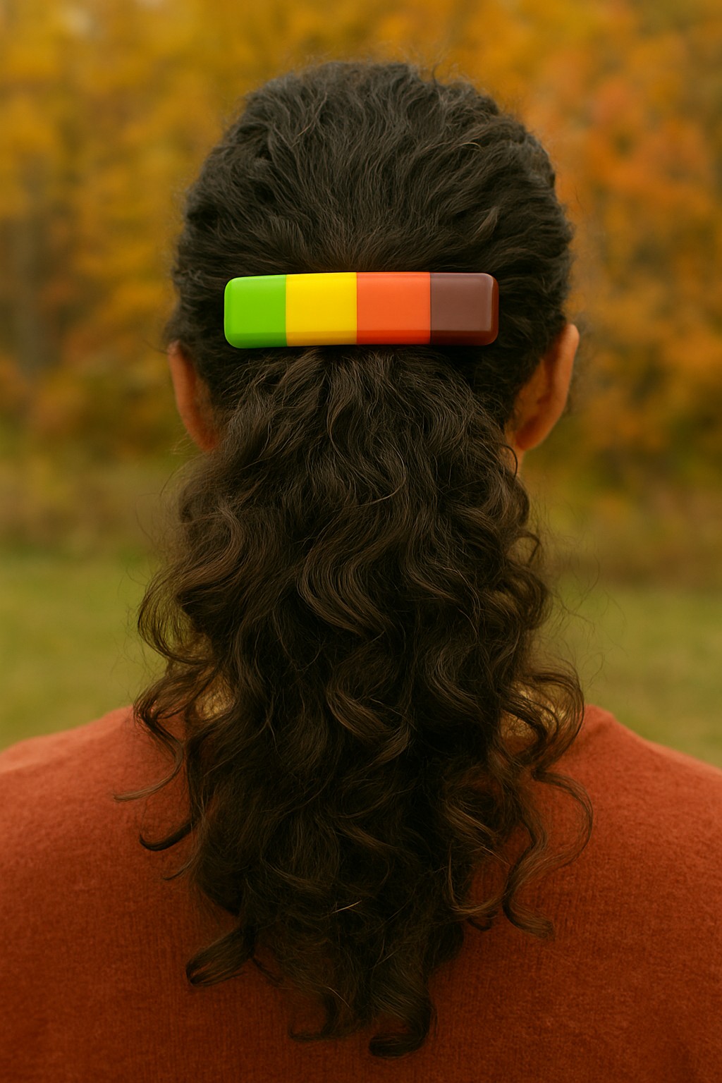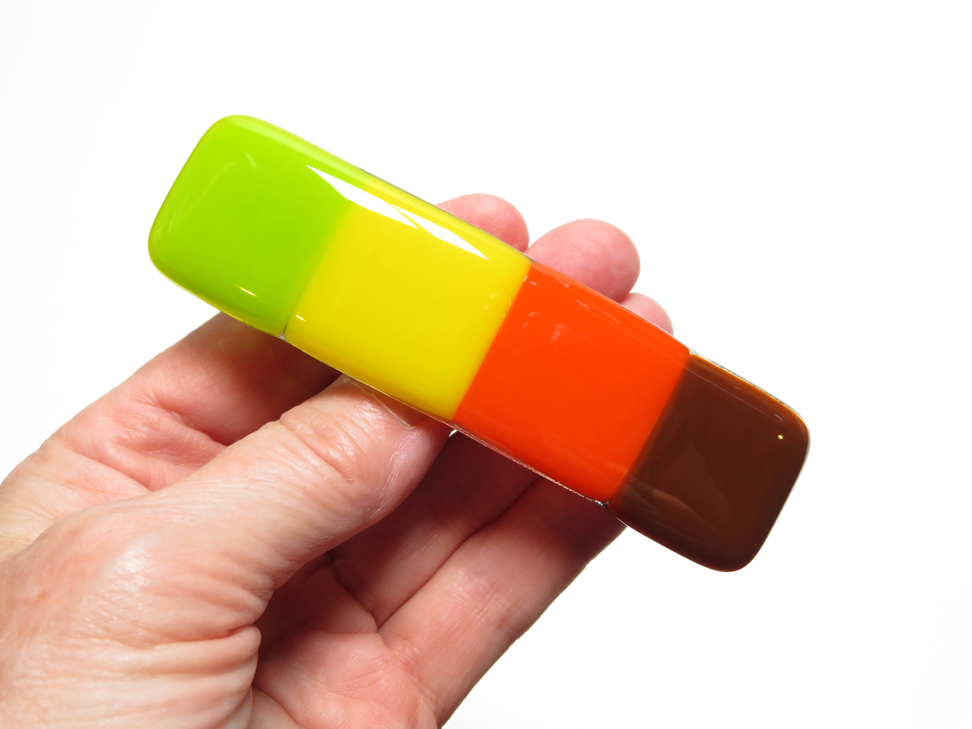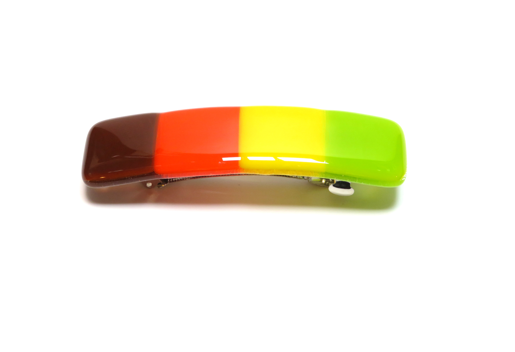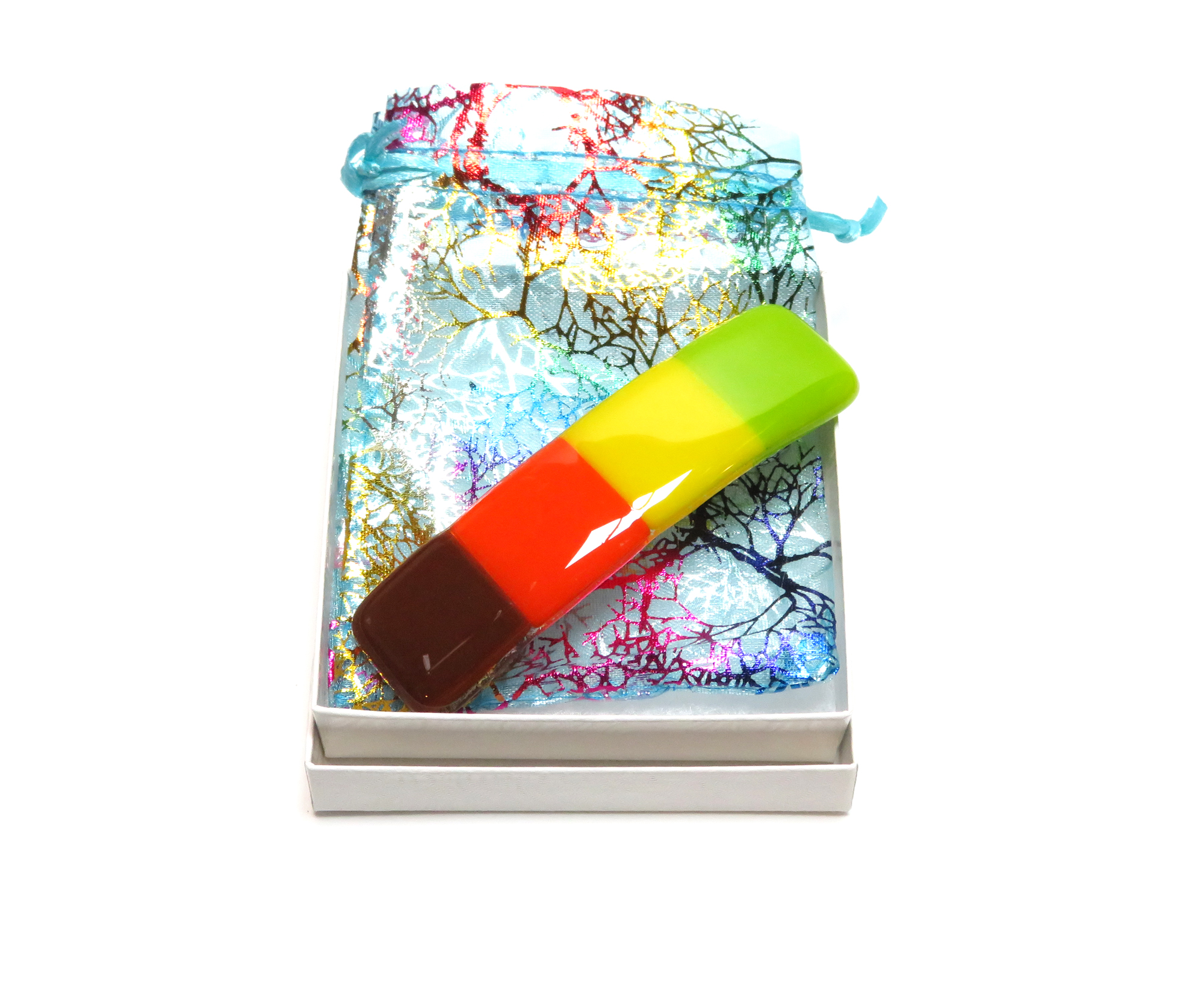 This autumn-inspired fused glass barrette from Partners in Glass captures the rich colors of the season — golden yellow, pumpkin orange, cocoa brown, and a touch of fresh green. Each piece is individually kiln-fired for over 8 hours, creating a smooth, glossy finish that reflects the glow of fall leaves and cozy gatherings.