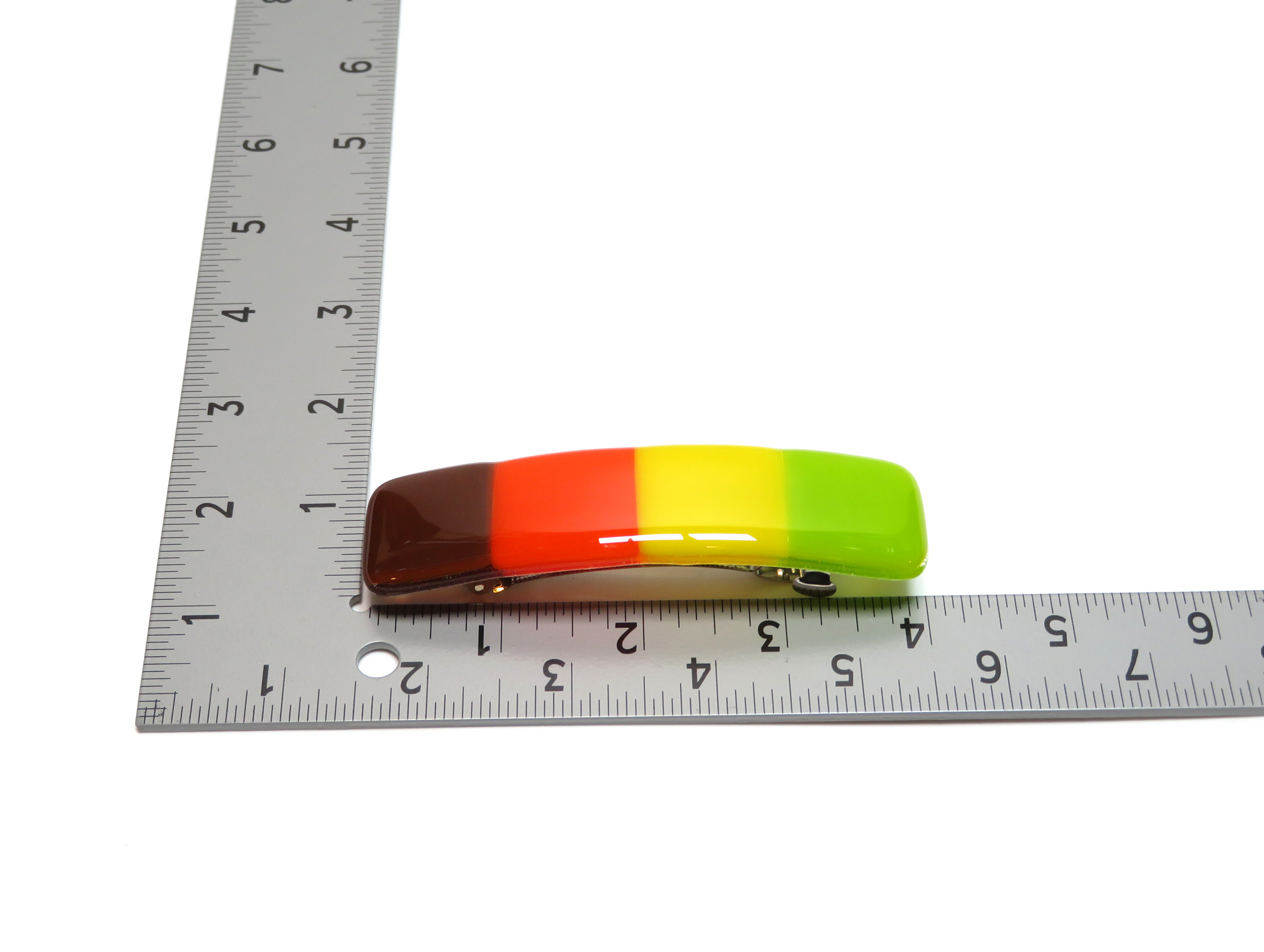 All pieces are original designs and carefully hand-cut, arranged, and fired in my kiln. Once fired, the edges of the barrette are cleaned up and returned to the kiln for a second firing to smooth out the edges and bring a final luster to the barrette. Finally, a French-style barrette clip is glued to the back of the barrette.