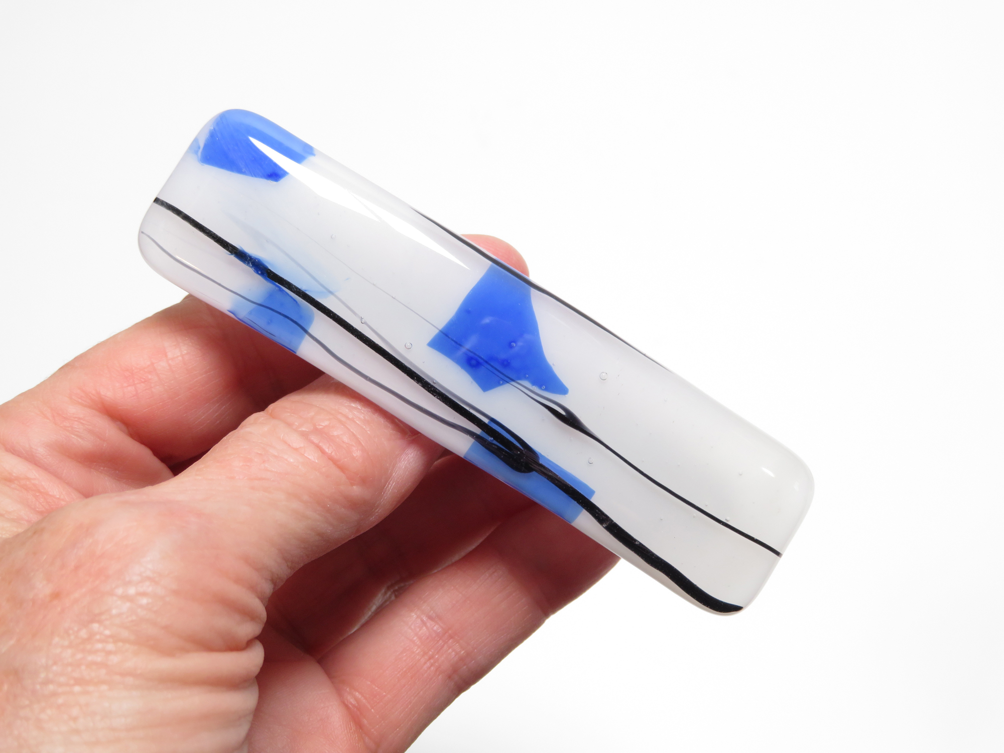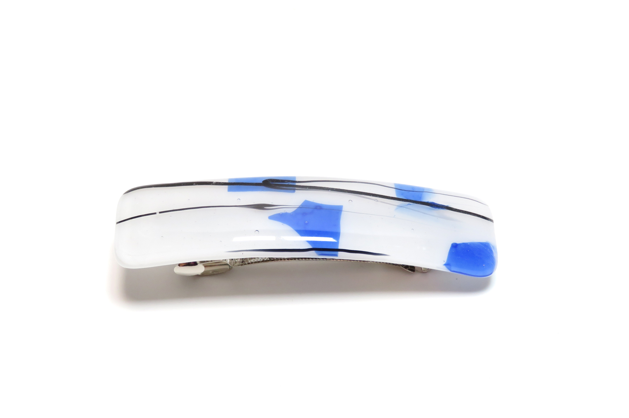 Bring modern elegance to your everyday style with this handcrafted blue and white fused glass barrette, designed specifically for thick hair. Kiln-fired in my Minnesota studio, this 4-inch glass hair clip features crisp geometric blues, soft white glass, and artistic black stringer lines for a clean, contemporary look.