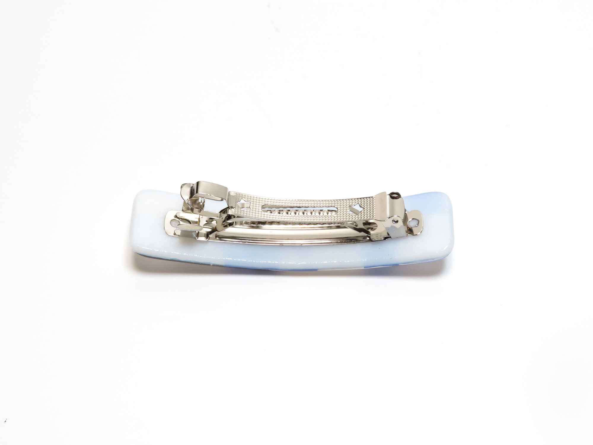All pieces are original designs and carefully hand-cut, arranged, and fired in my kiln. Once fired, the edges of the barrette are cleaned up and returned to the kiln for a second firing to smooth out the edges and bring a final luster to the barrette. Finally, a French-style barrette clip is glued to the back of the barrette.