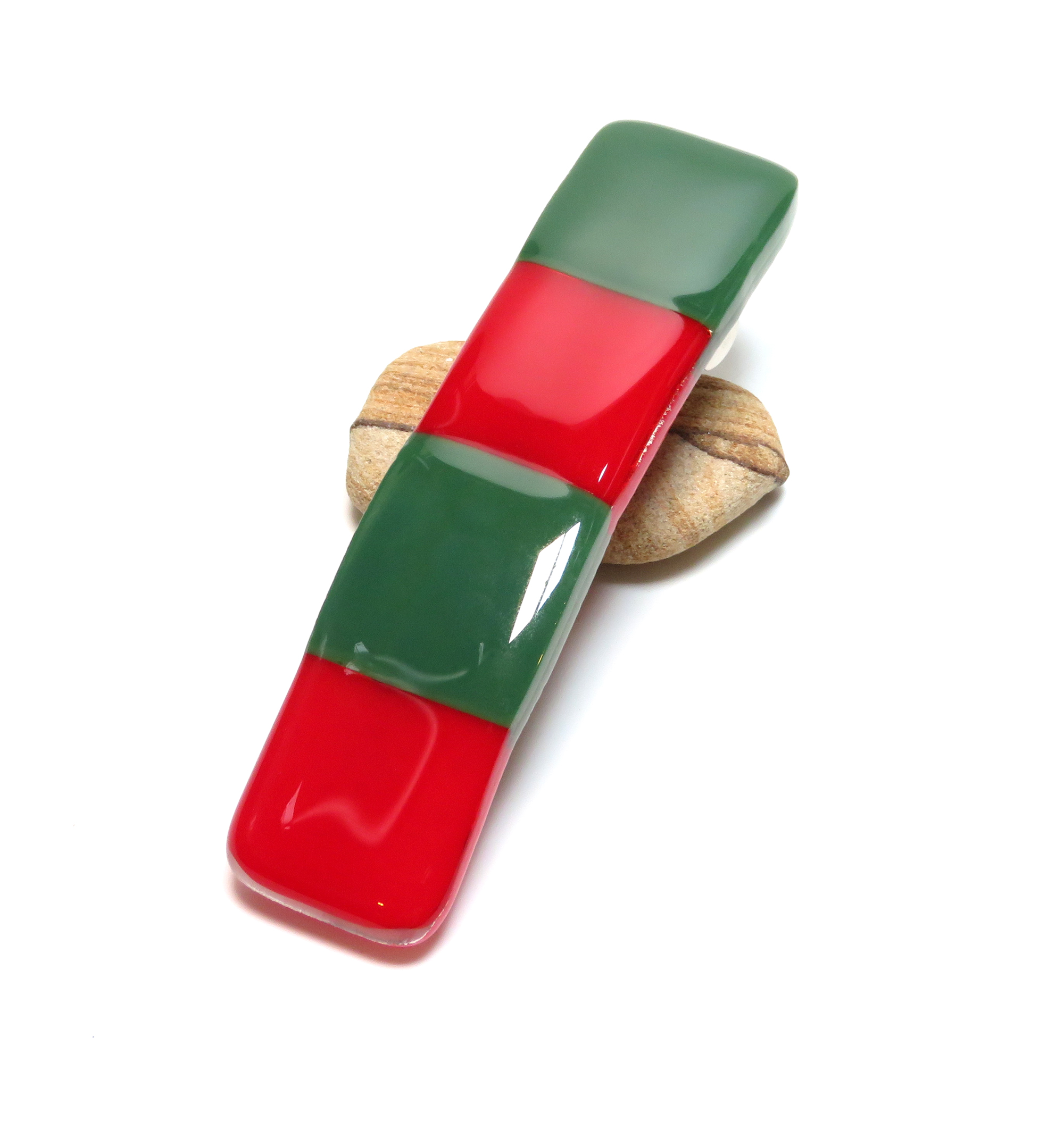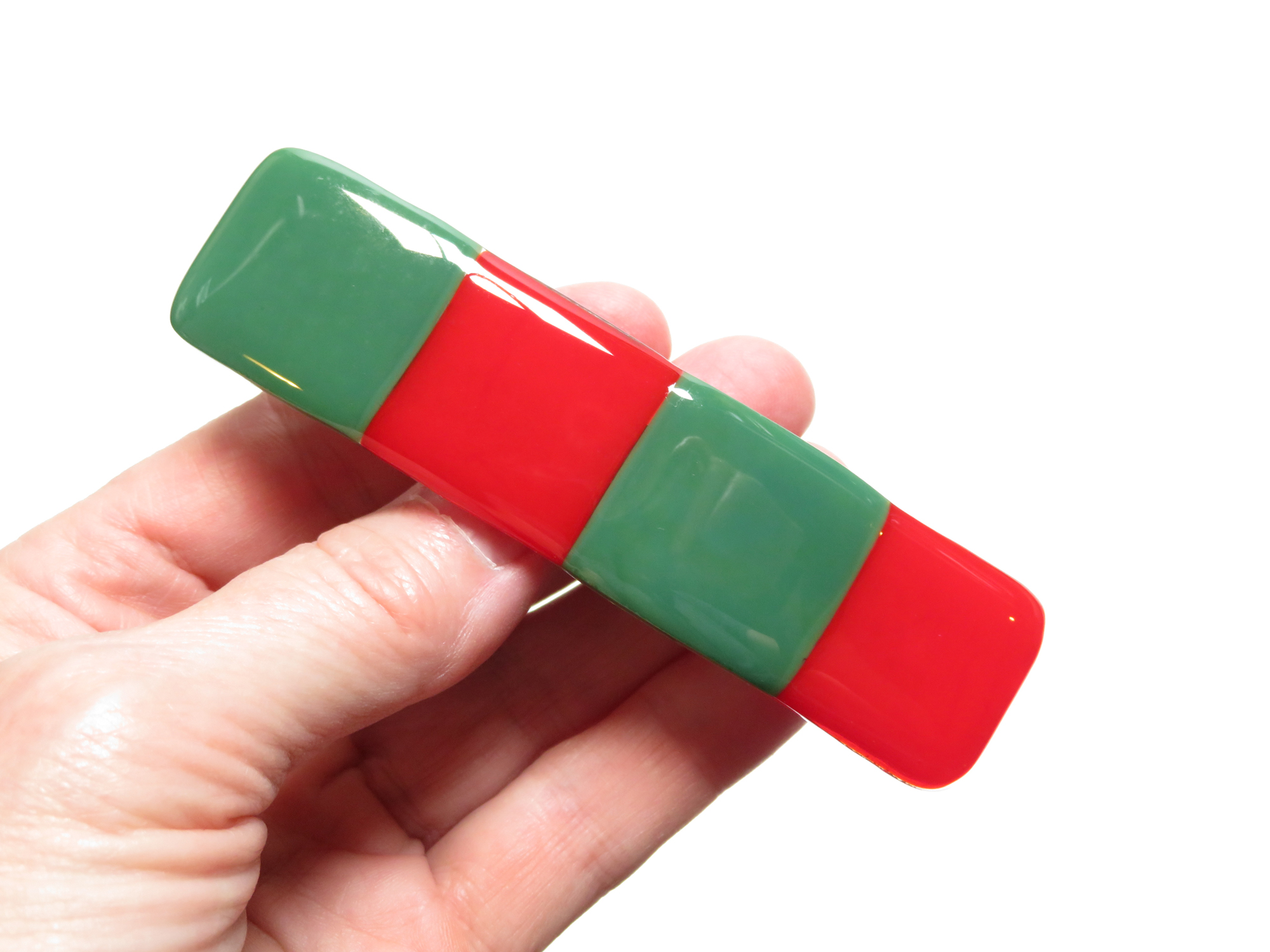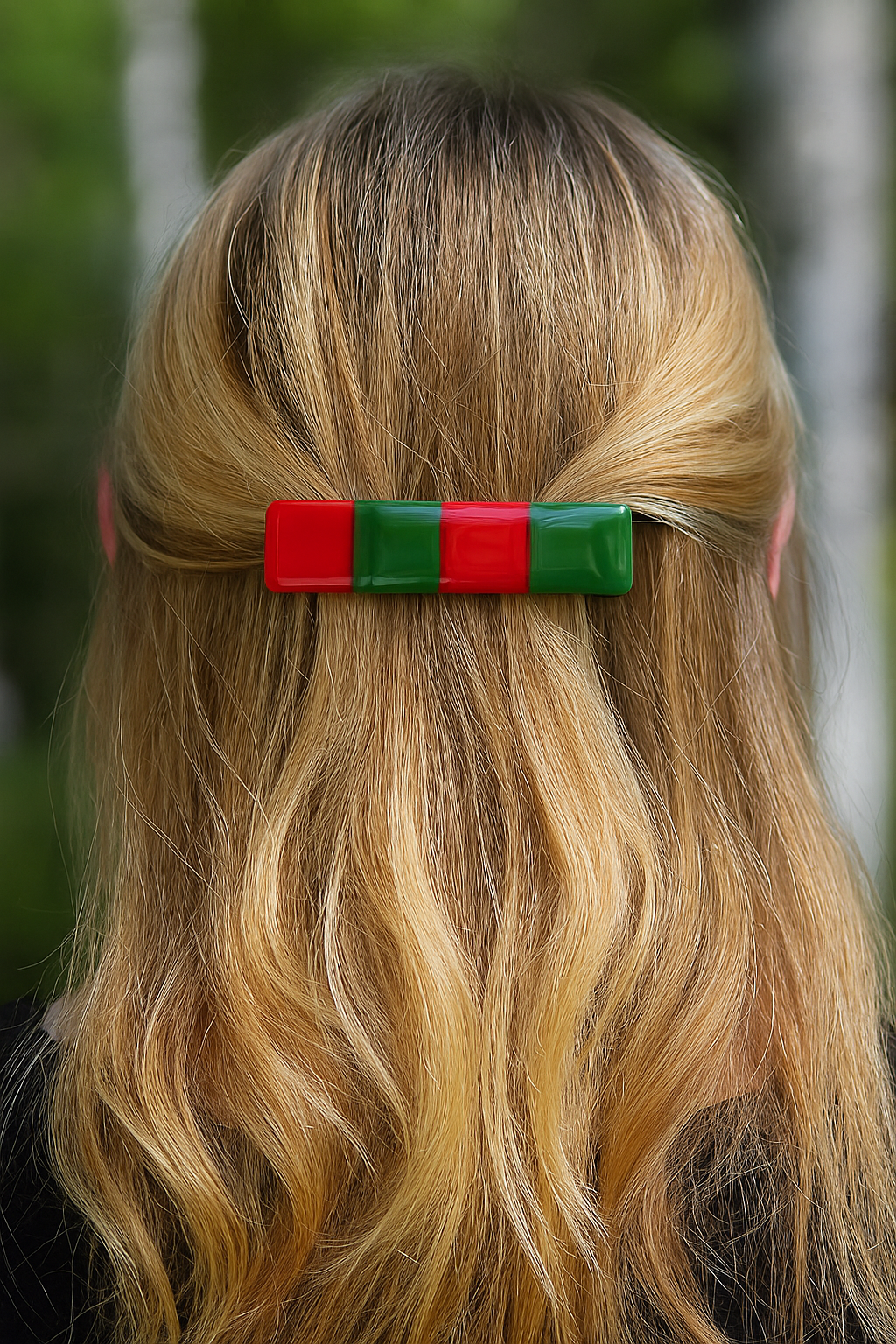 Celebrate the holiday season in style with this handcrafted fused glass barrette, designed especially for thick hair. Featuring a bold red and green color block pattern, this festive accessory adds cheerful elegance to your Christmas and winter outfits — perfect for holiday gatherings, family photos, and gift giving.
