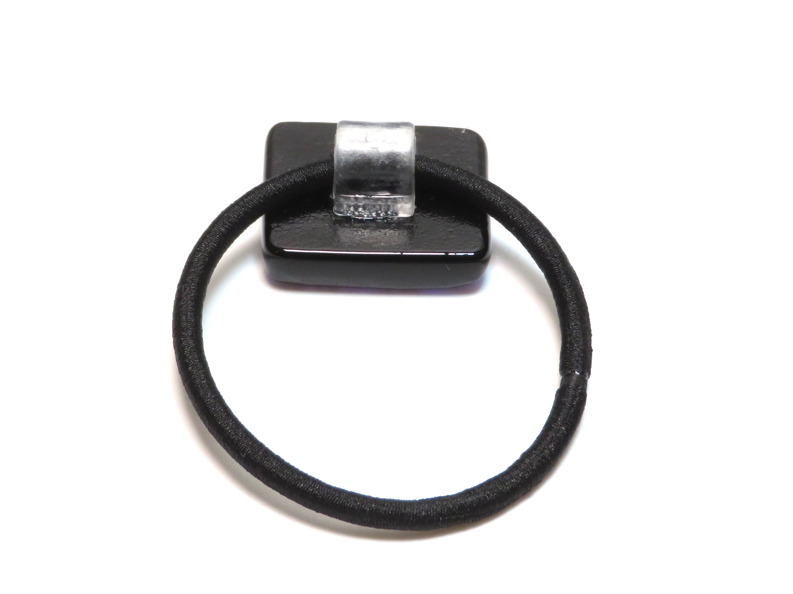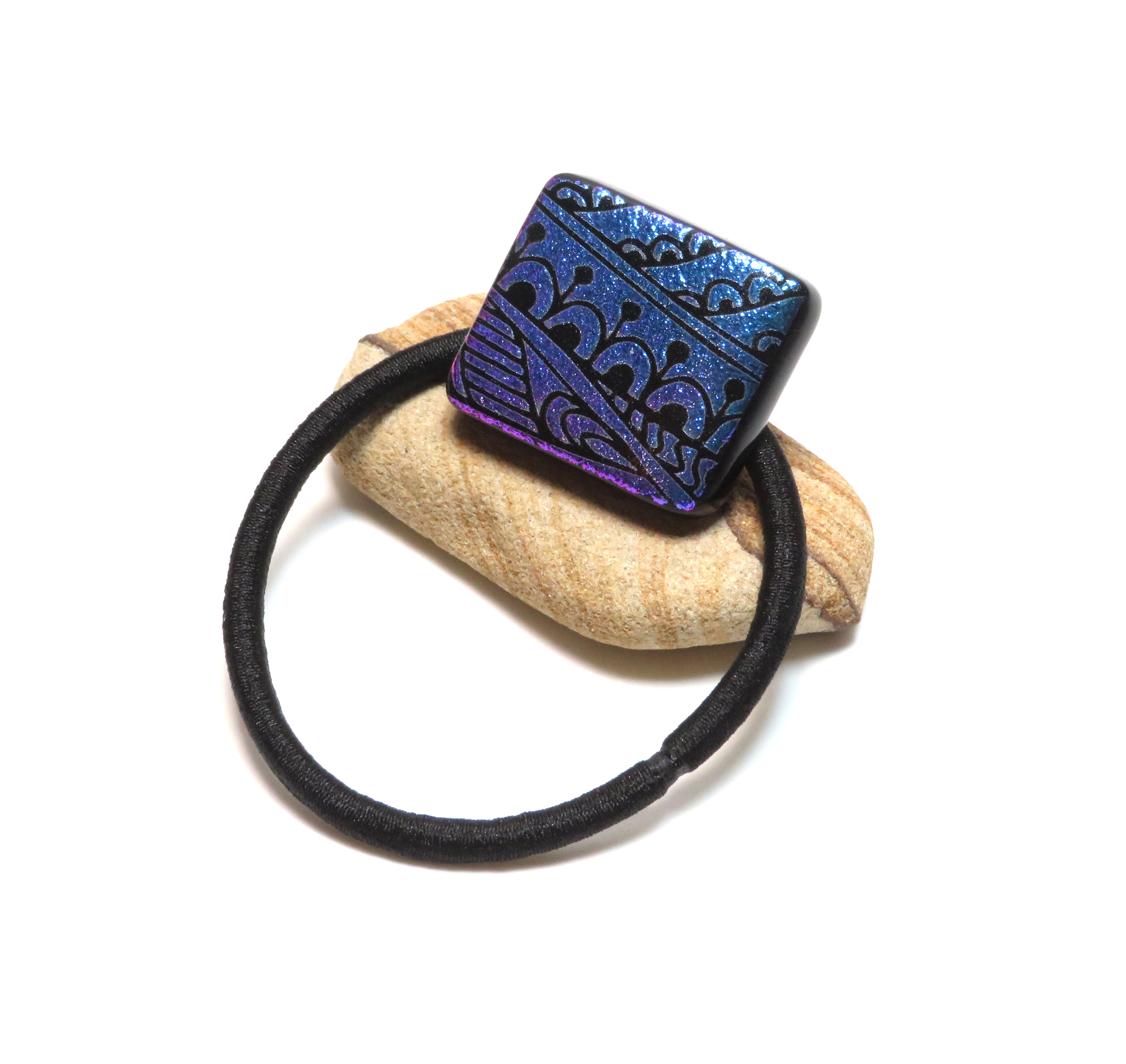 Handmade in my Minnesota studio, this dichroic glass ponytail holder is kiln-fired for over eight hours. Each piece fuses layers of glass into a one-of-a-kind surface that sparkles with iridescent rainbow flashes as it catches the light.