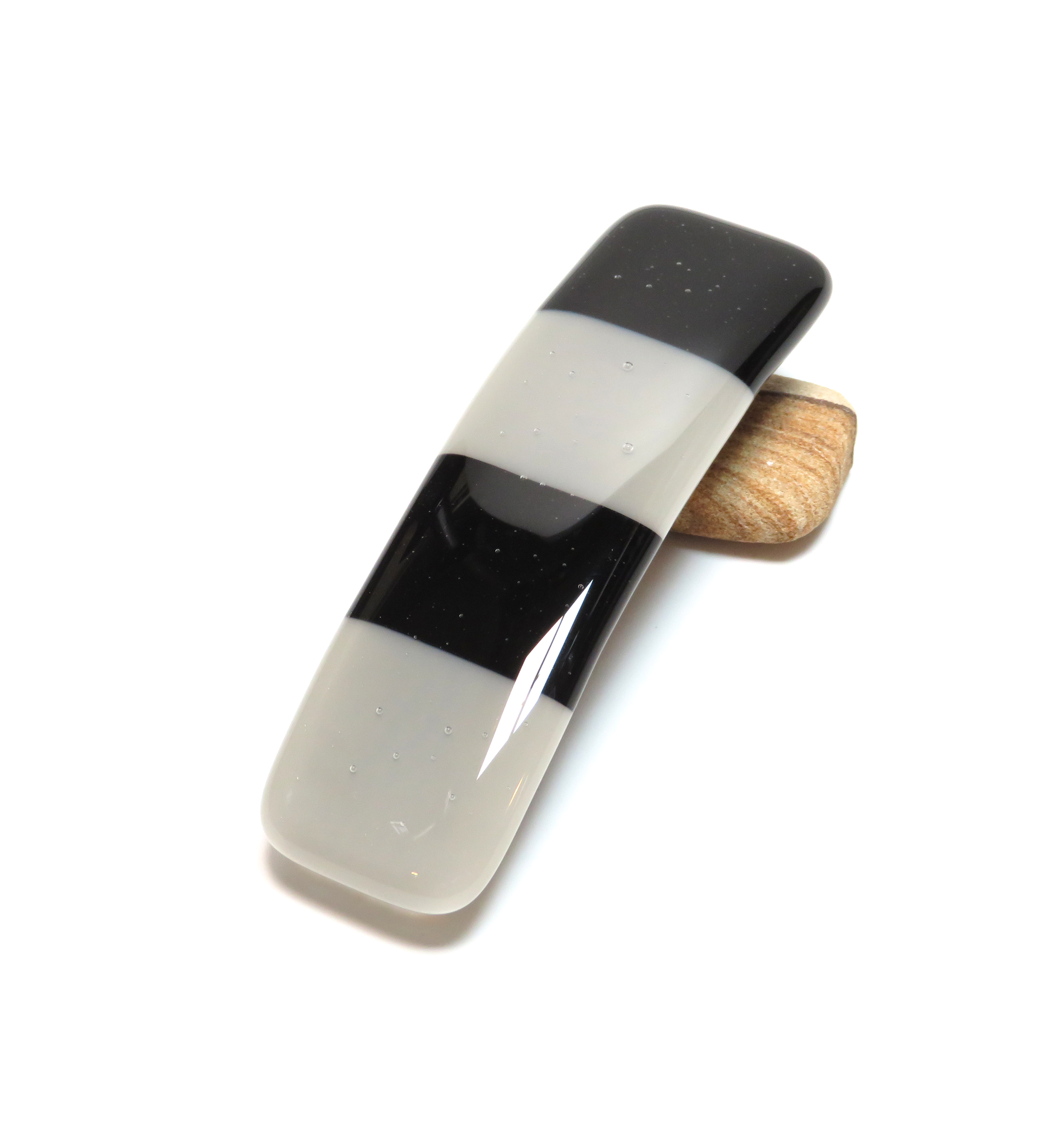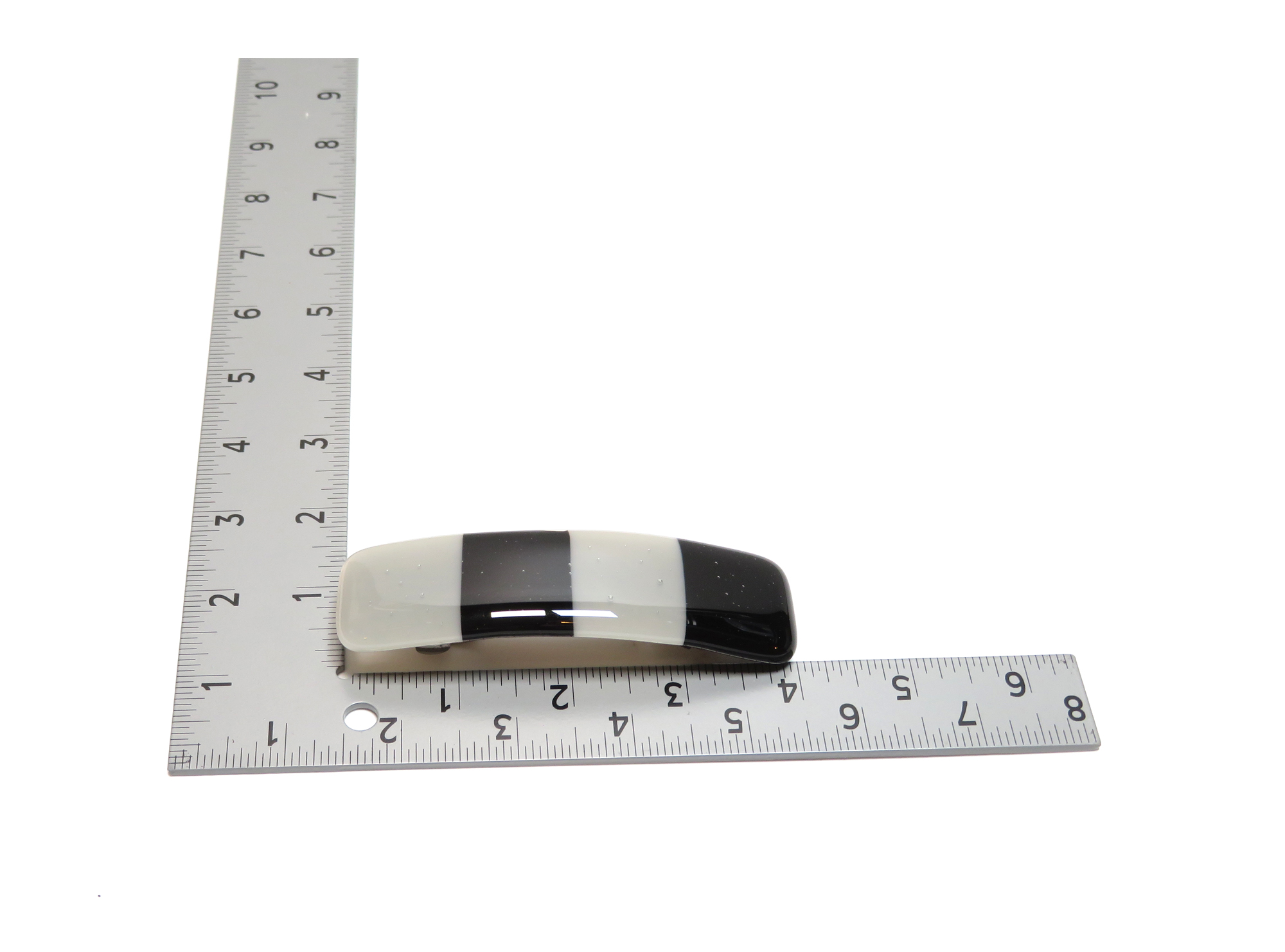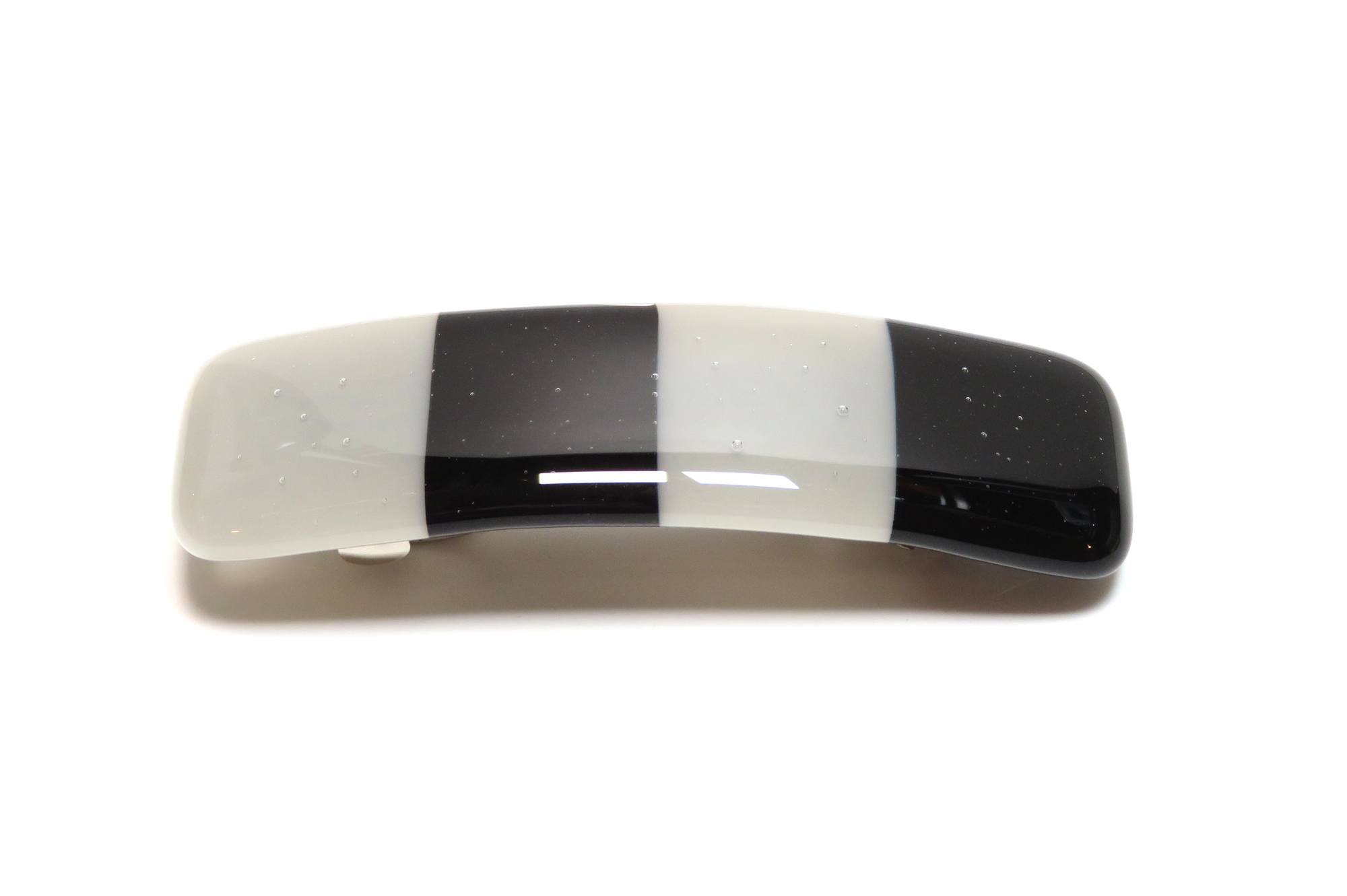 This 4 x 1-inch fused glass barrette by Partners in Glass features alternating glossy panels of opaque gray and deep black—sleek, modern, and perfect for any season. Kiln-fired for lasting strength and finished with a high-quality French clip, it’s ideal for thick or full hair and adds sophisticated contrast to any hairstyle.