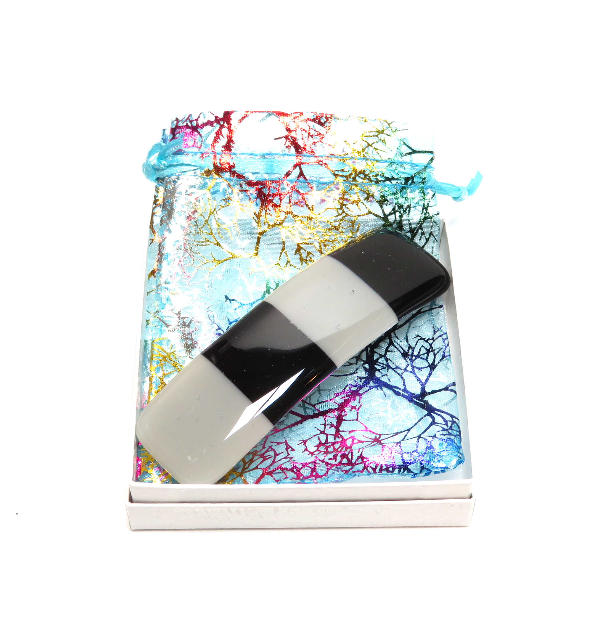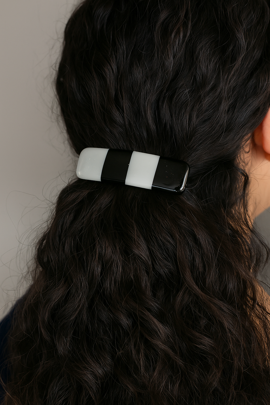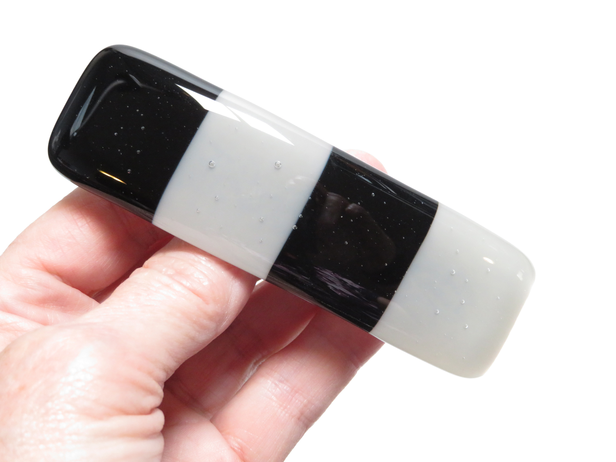 This 4 x 1-inch fused glass barrette by Partners in Glass features alternating glossy panels of opaque gray and deep black—sleek, modern, and perfect for any season. Kiln-fired for lasting strength and finished with a high-quality French clip, it’s ideal for thick or full hair and adds sophisticated contrast to any hairstyle.