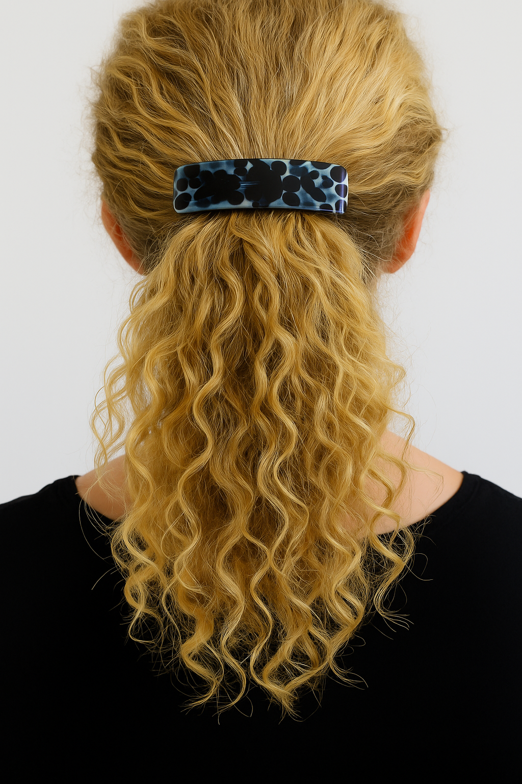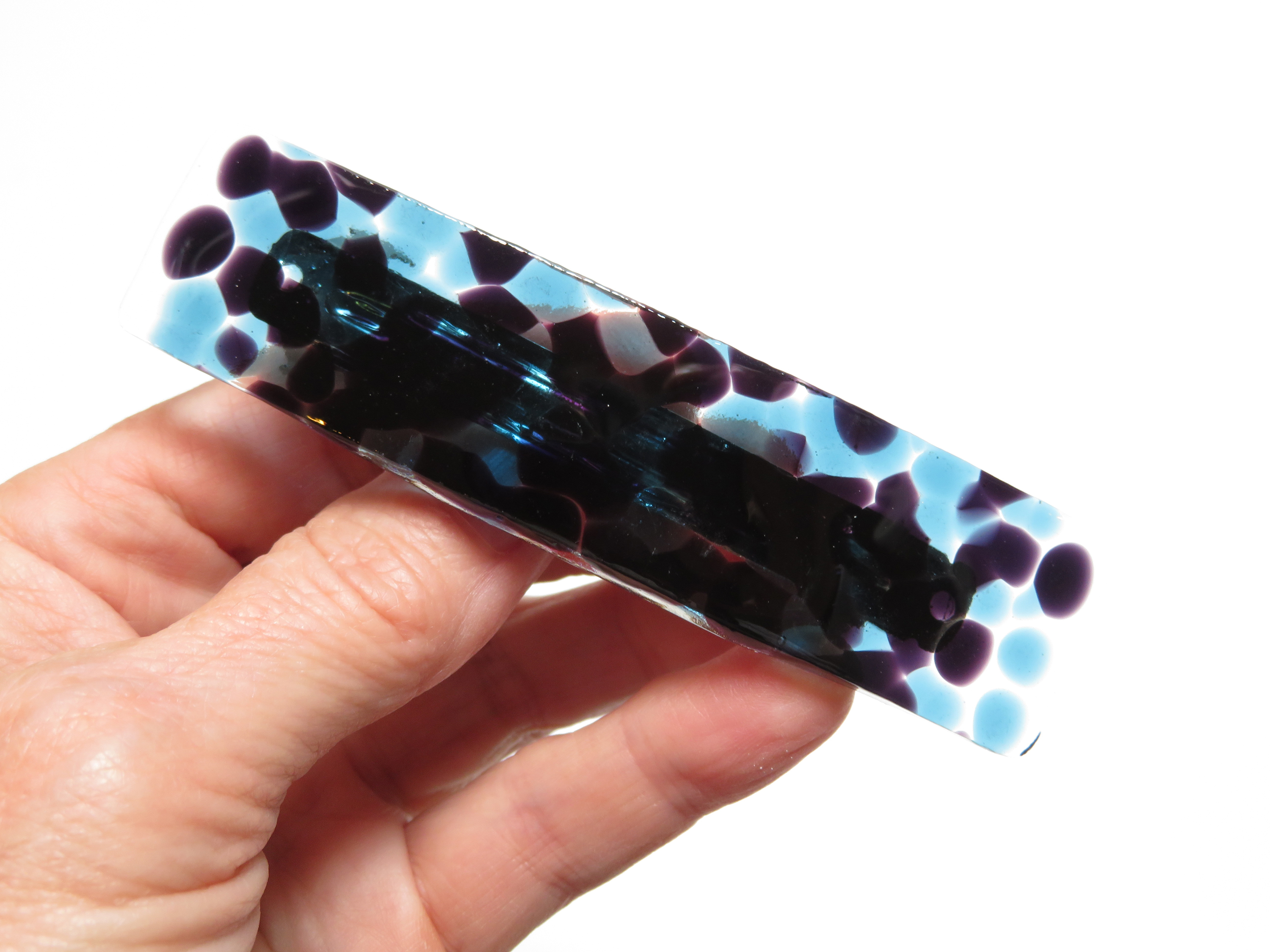 All pieces are original designs and carefully hand-cut, arranged, and fired in my kiln. Once fired, the edges of the barrette are cleaned up and returned to the kiln for a second firing to smooth out the edges and bring a final luster to the barrette. The barrette is then slumped at a lower temperature to give it a slight curve. Finally, a French-style barrette clip is glued to the back of the barrette.