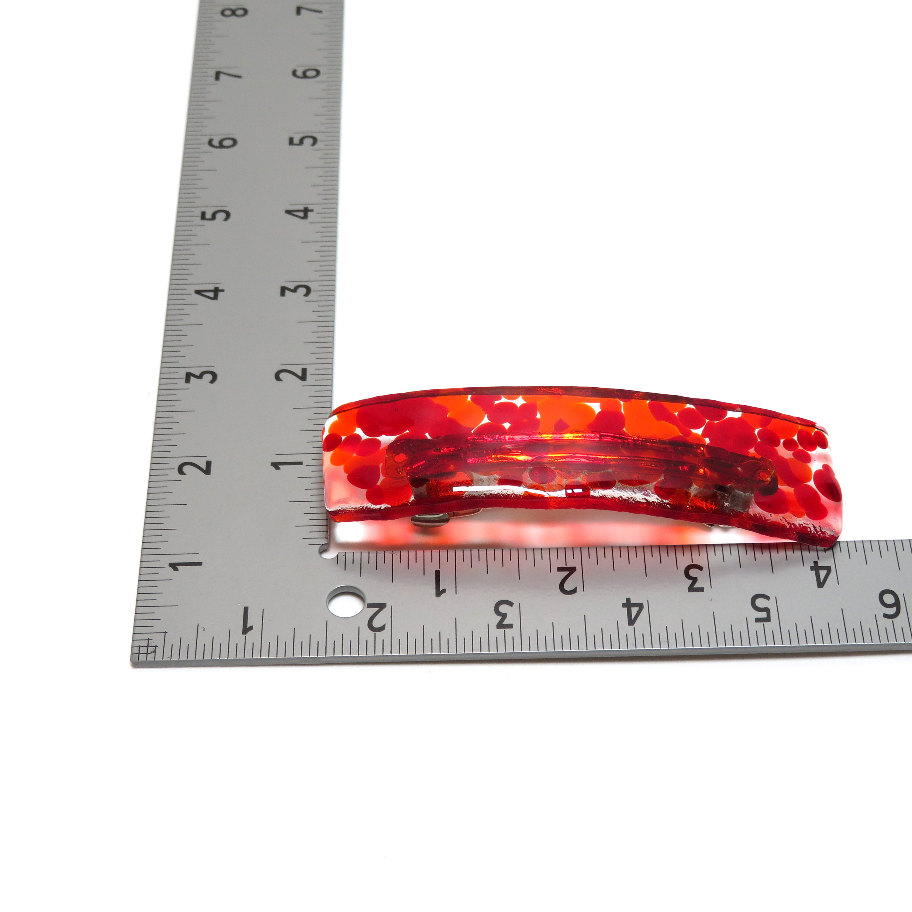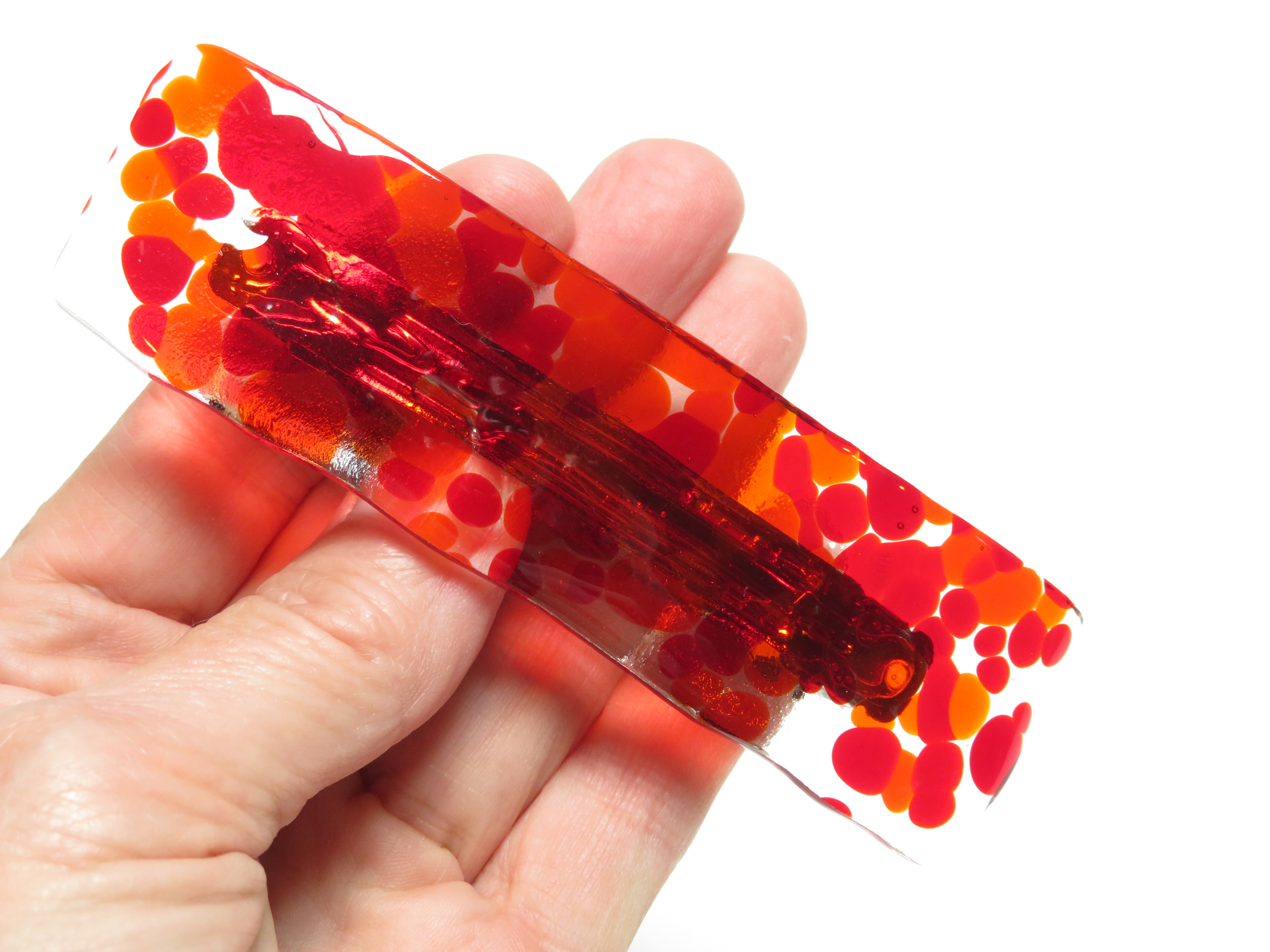 Bright and bold, this fused glass barrette features fiery shades of red and orange created with crushed glass.