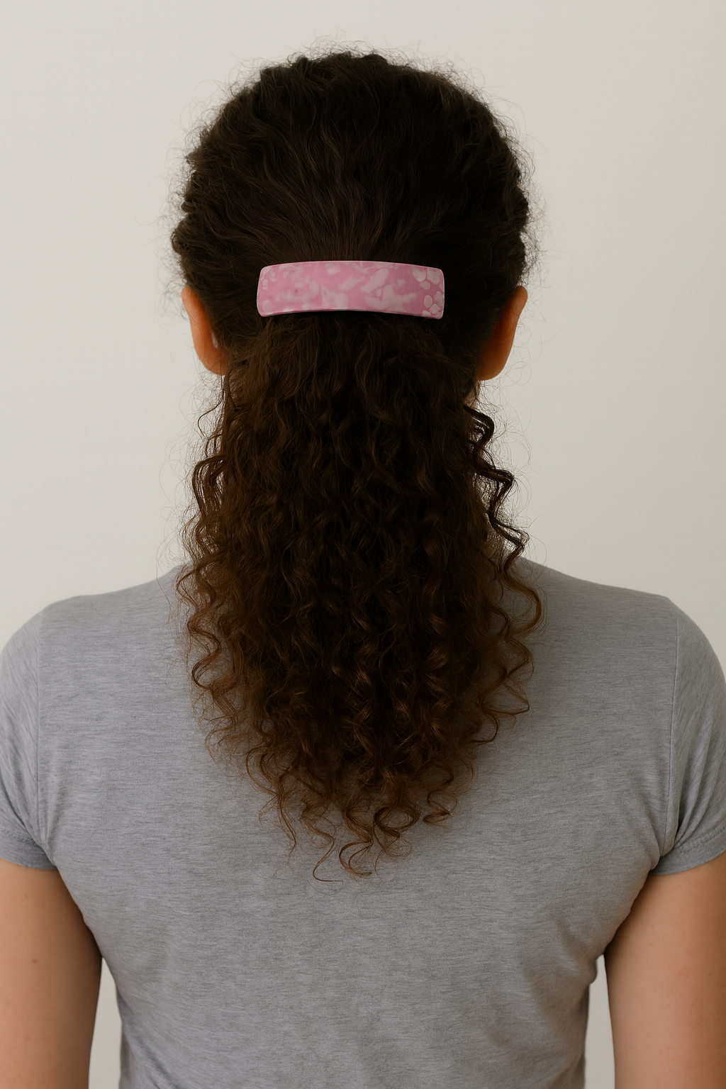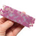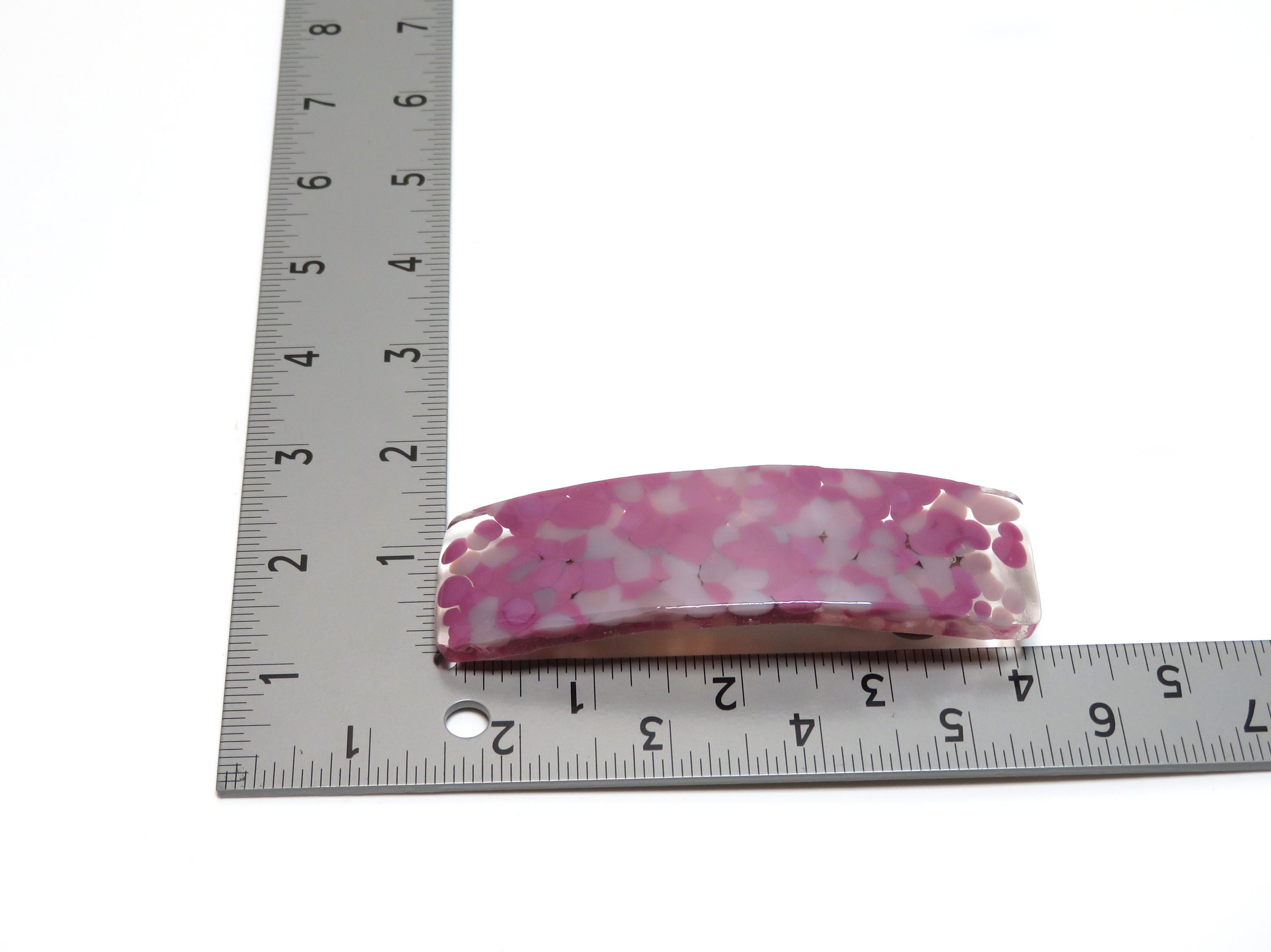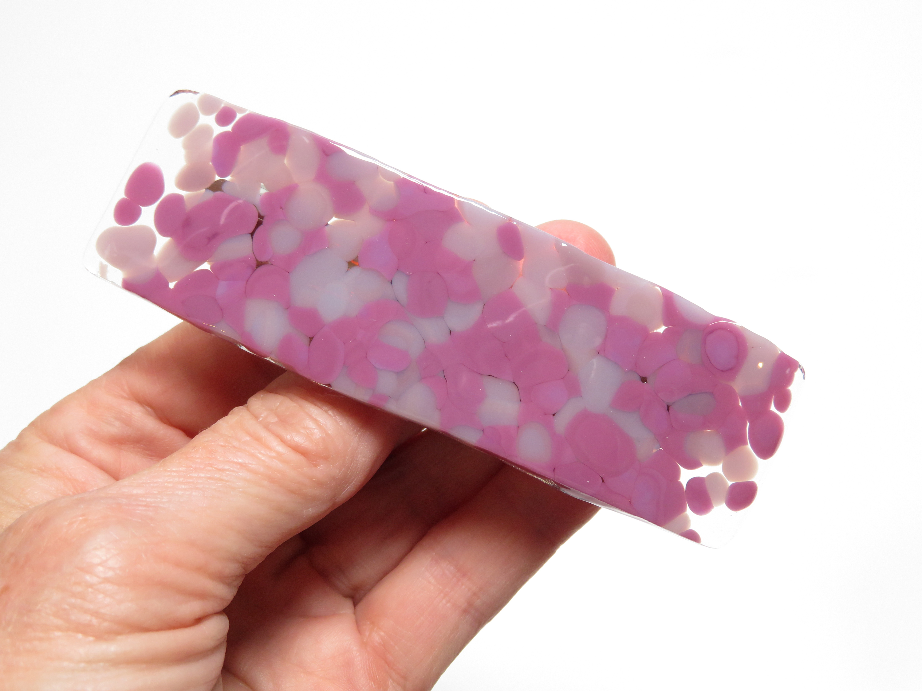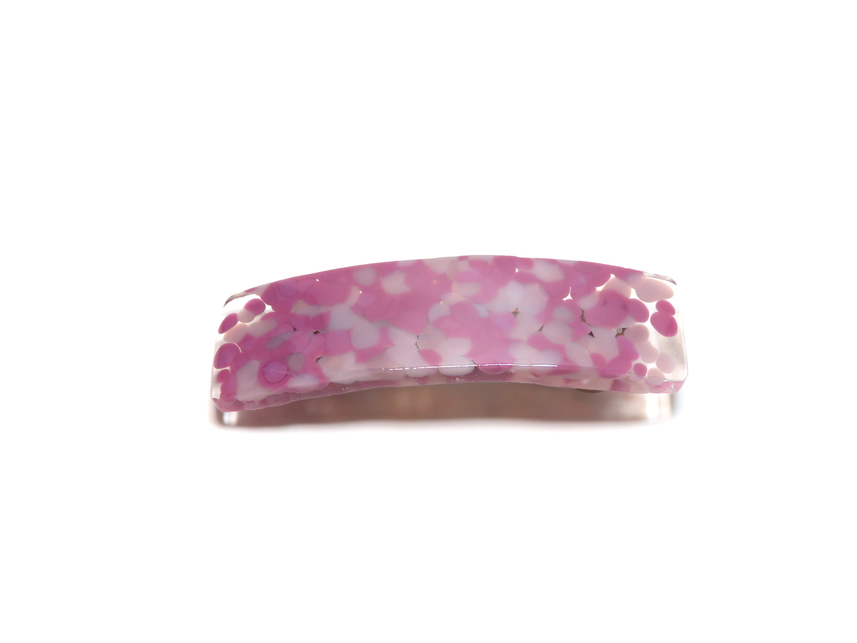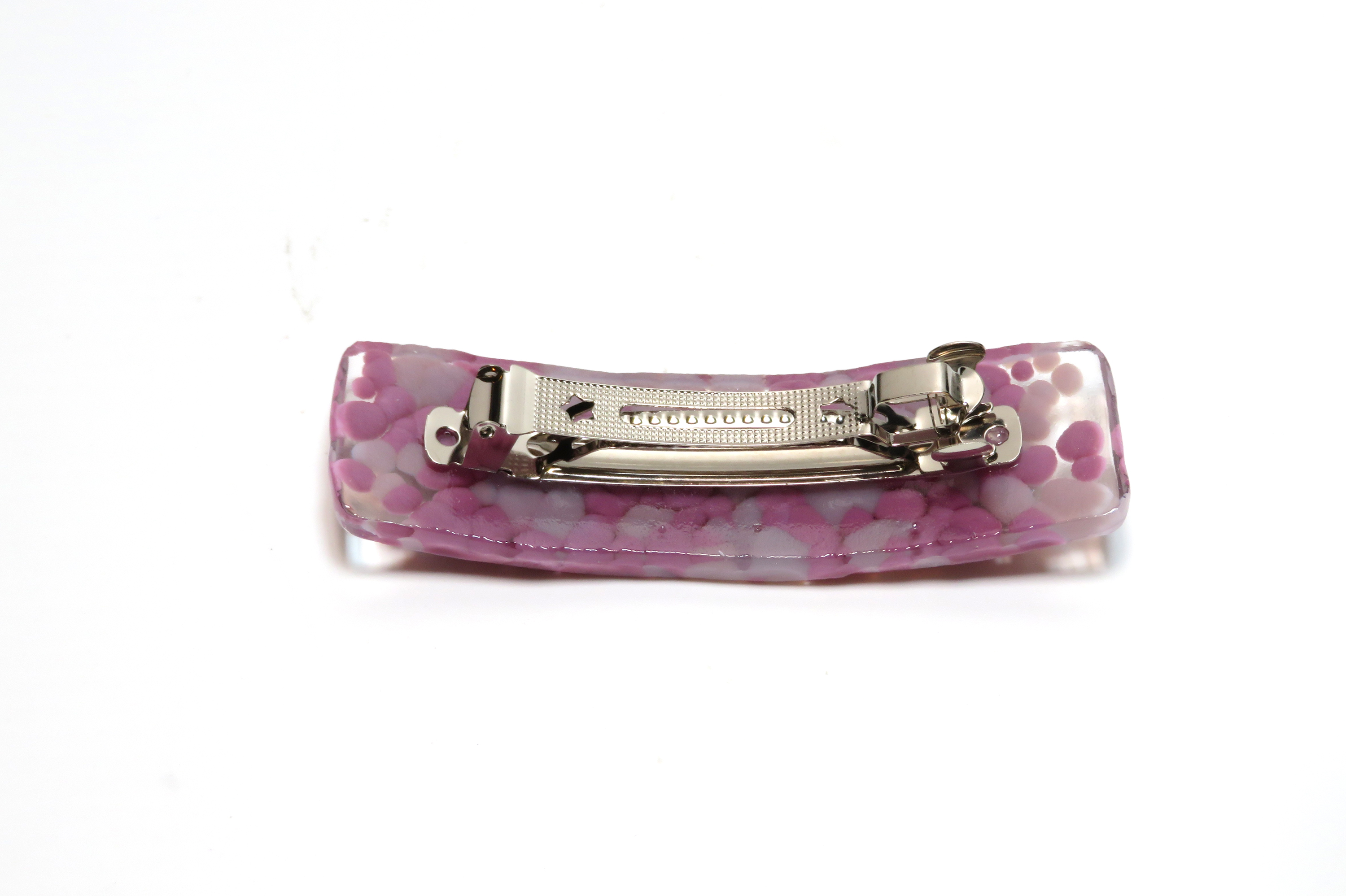 This elegant 4-inch fused glass barrette features soft pink and lavender tones created with crushed glass. The sturdy French clip is ideal for thick hair, making it both stylish and practical.