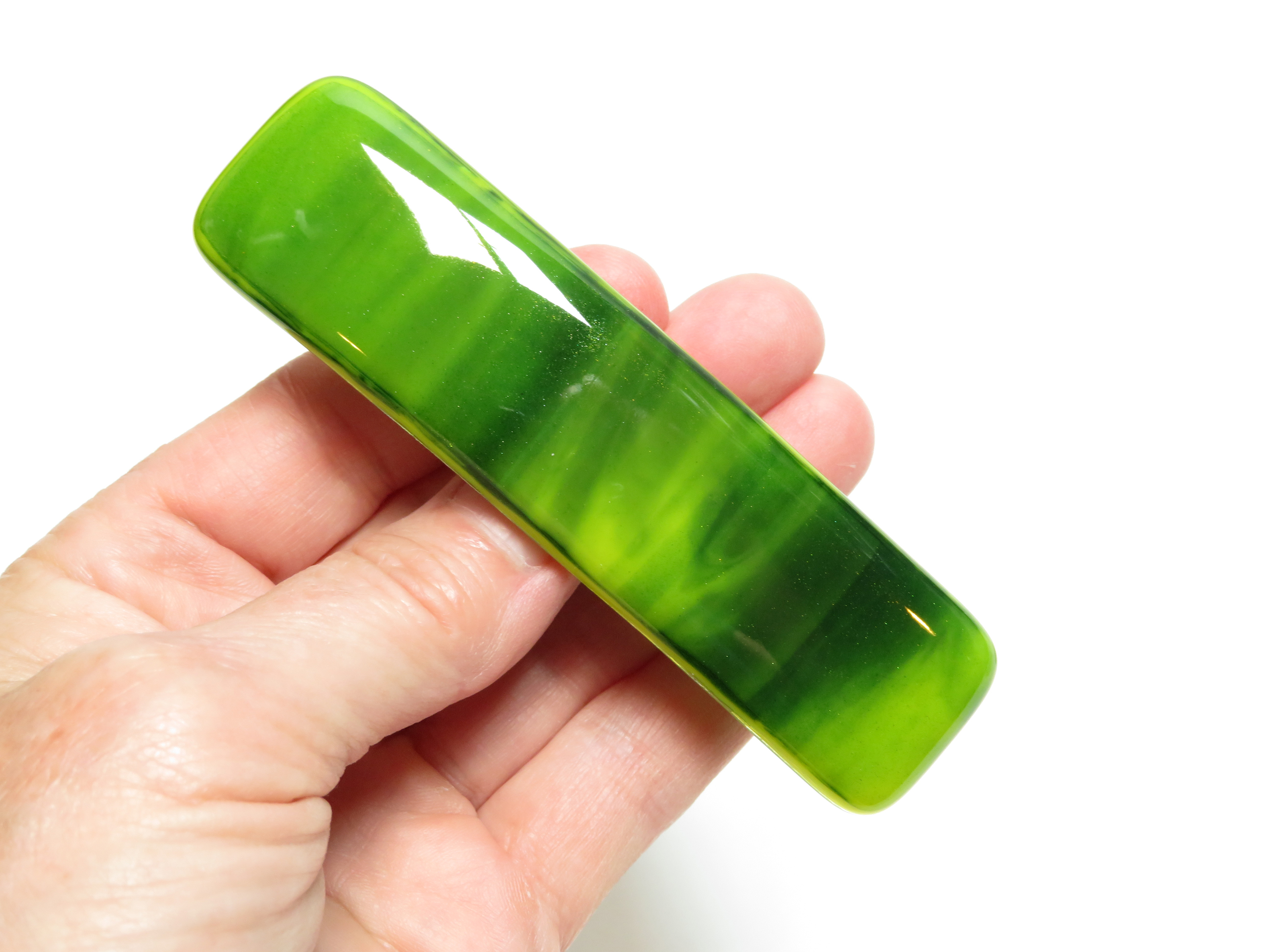 All pieces are original designs and carefully hand-cut, arranged, and fired in my kiln. Once fired, the edges of the barrette are cleaned up and returned to the kiln for a second firing to smooth out the edges and bring a final luster to the barrette. Finally, a French-style barrette clip is glued to the back of the barrette.