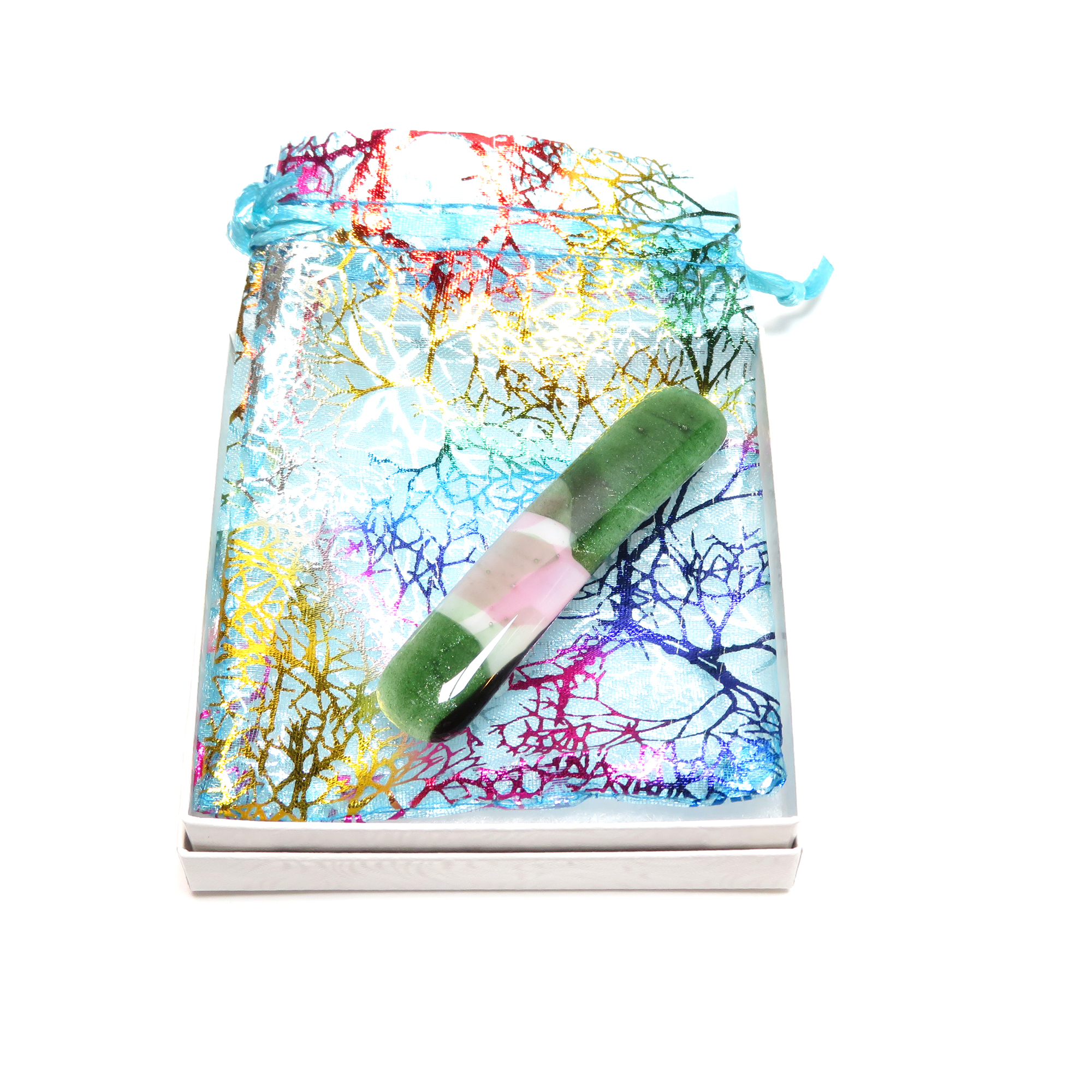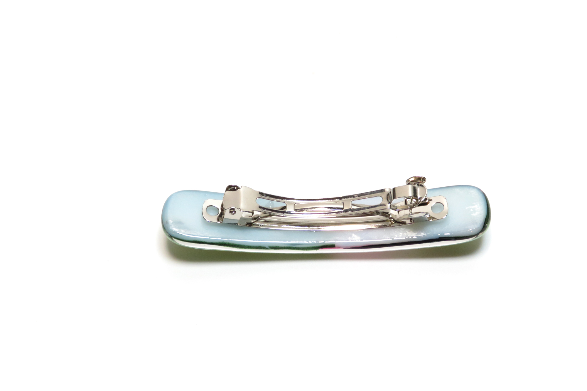 All pieces are original designs and carefully hand-cut, arranged, and fired in my kiln. Once fired, the edges of the barrette are cleaned up and returned to the kiln for a second firing to smooth out the edges and bring a final luster to the barrette. Finally, a French-style barrette clip is glued to the back of the barrette.