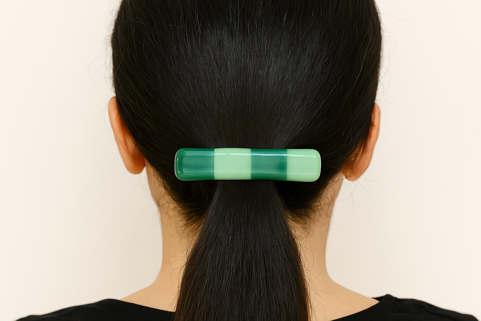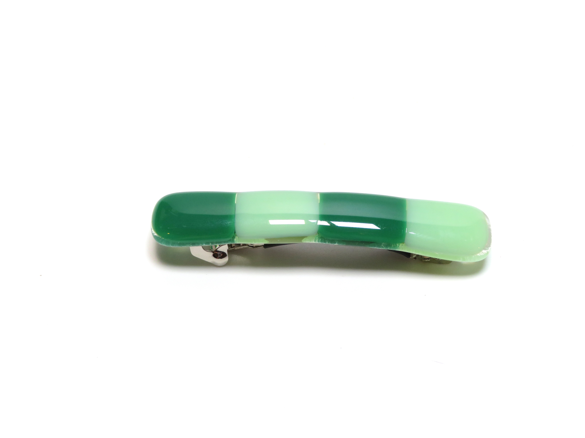 Bring a touch of handcrafted elegance to your everyday style with this green ombre fused glass barrette. The smooth gradient of mint, jade, and deep emerald tones creates a soothing, nature-inspired palette that flatters every hair color and complements any outfit.