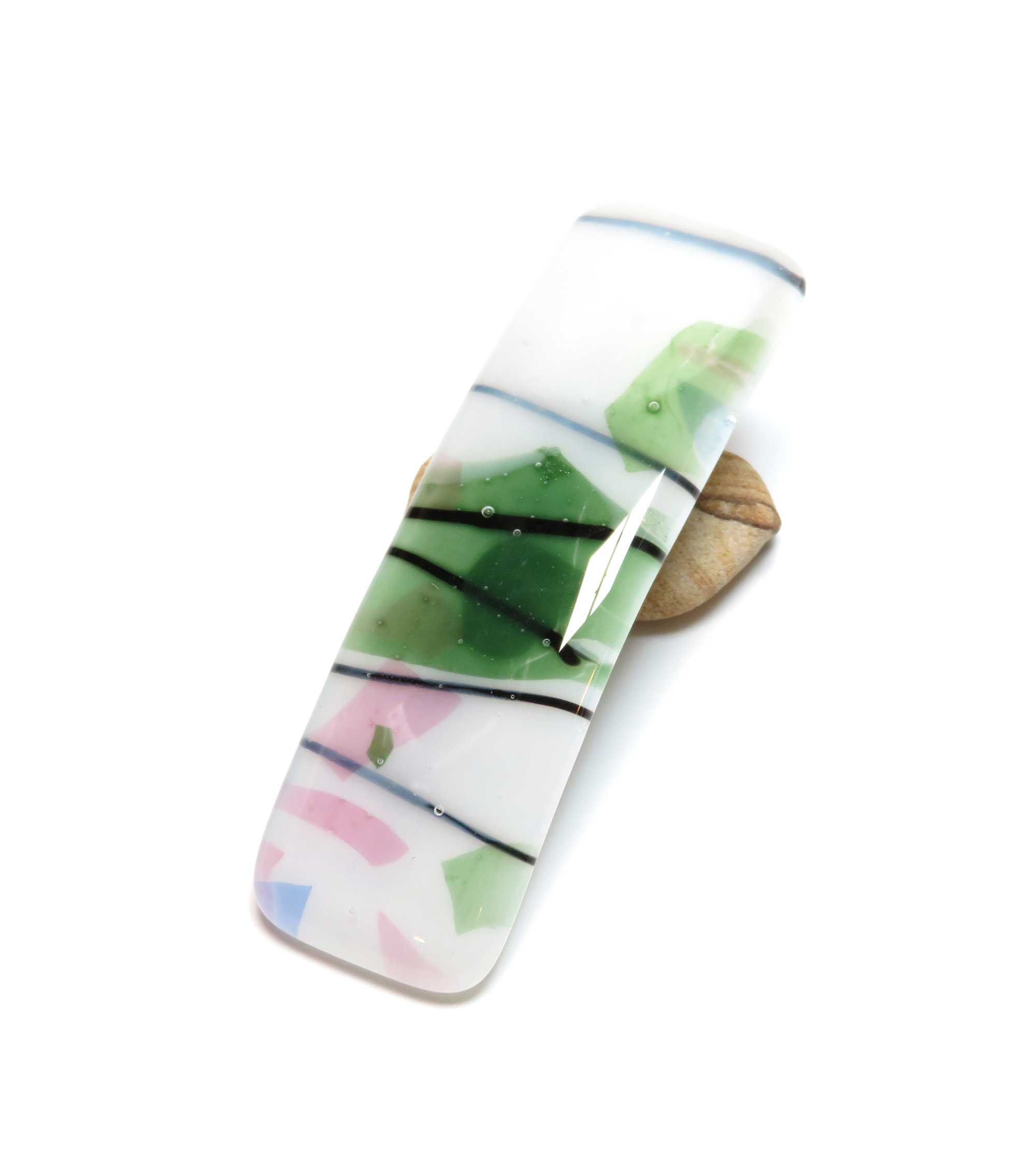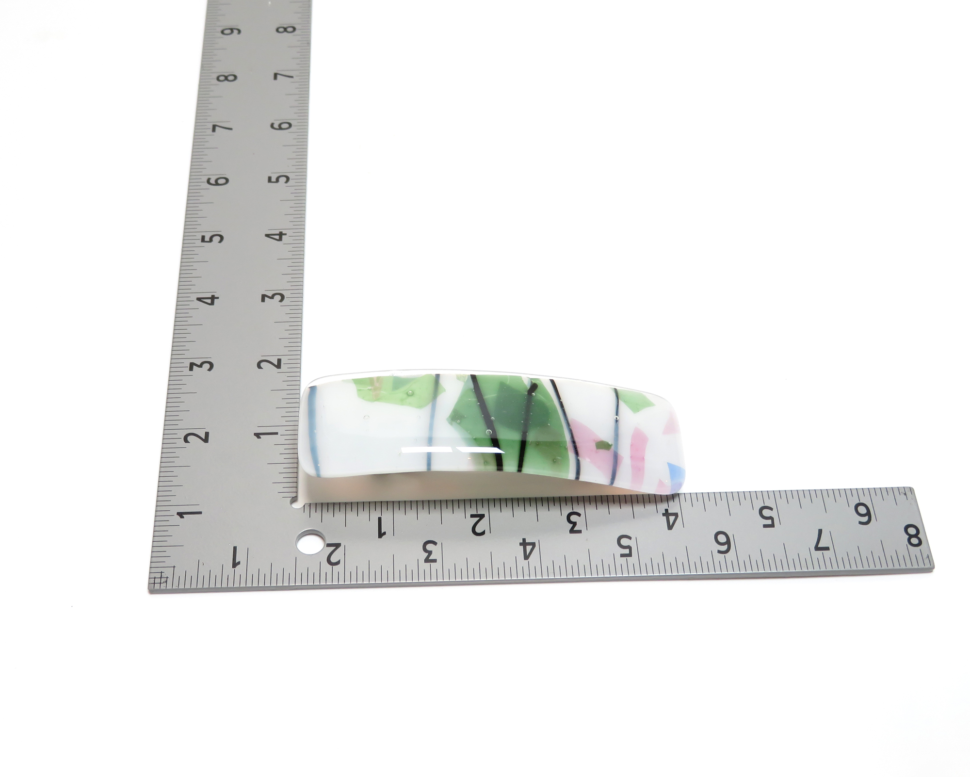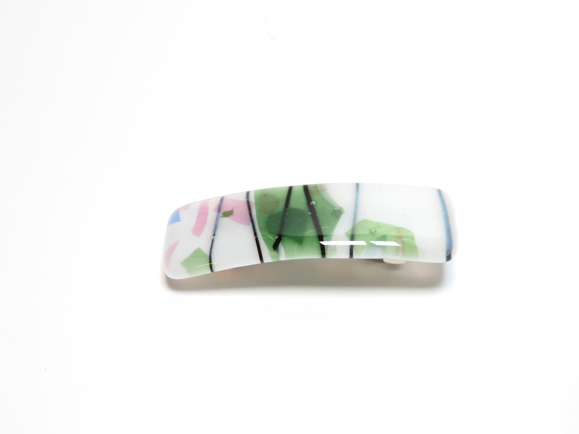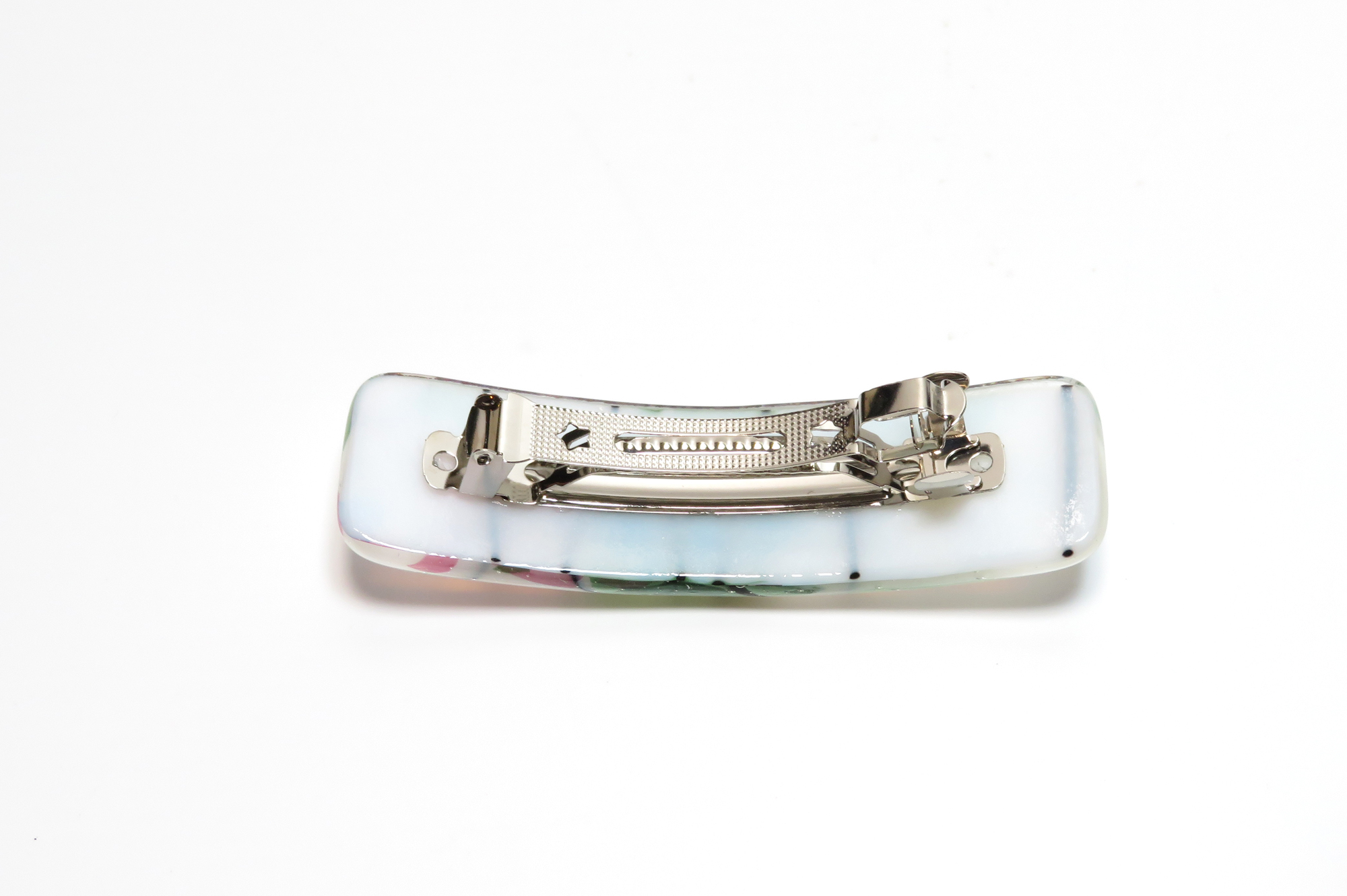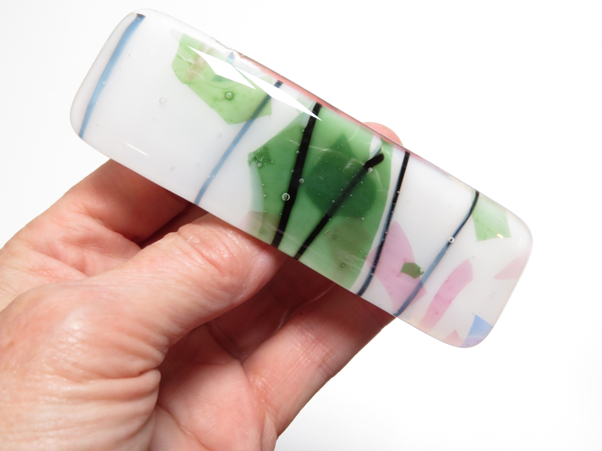 All pieces are original designs and carefully hand-cut, arranged, and fired in my kiln. Once fired, the edges of the barrette are cleaned up and returned to the kiln for a second firing to smooth out the edges and bring a final luster to the barrette. Finally, a French-style barrette clip is glued to the back of the barrette.