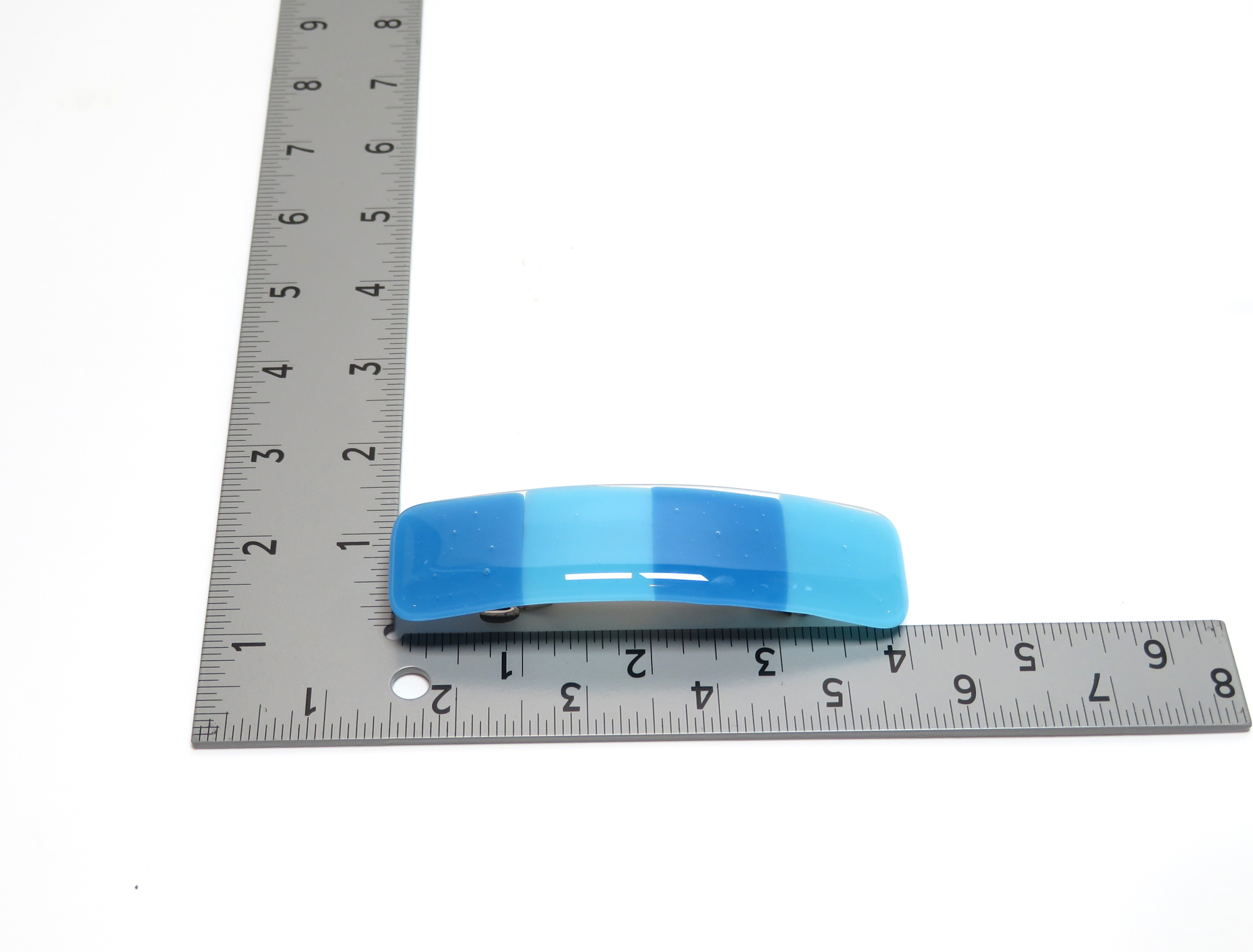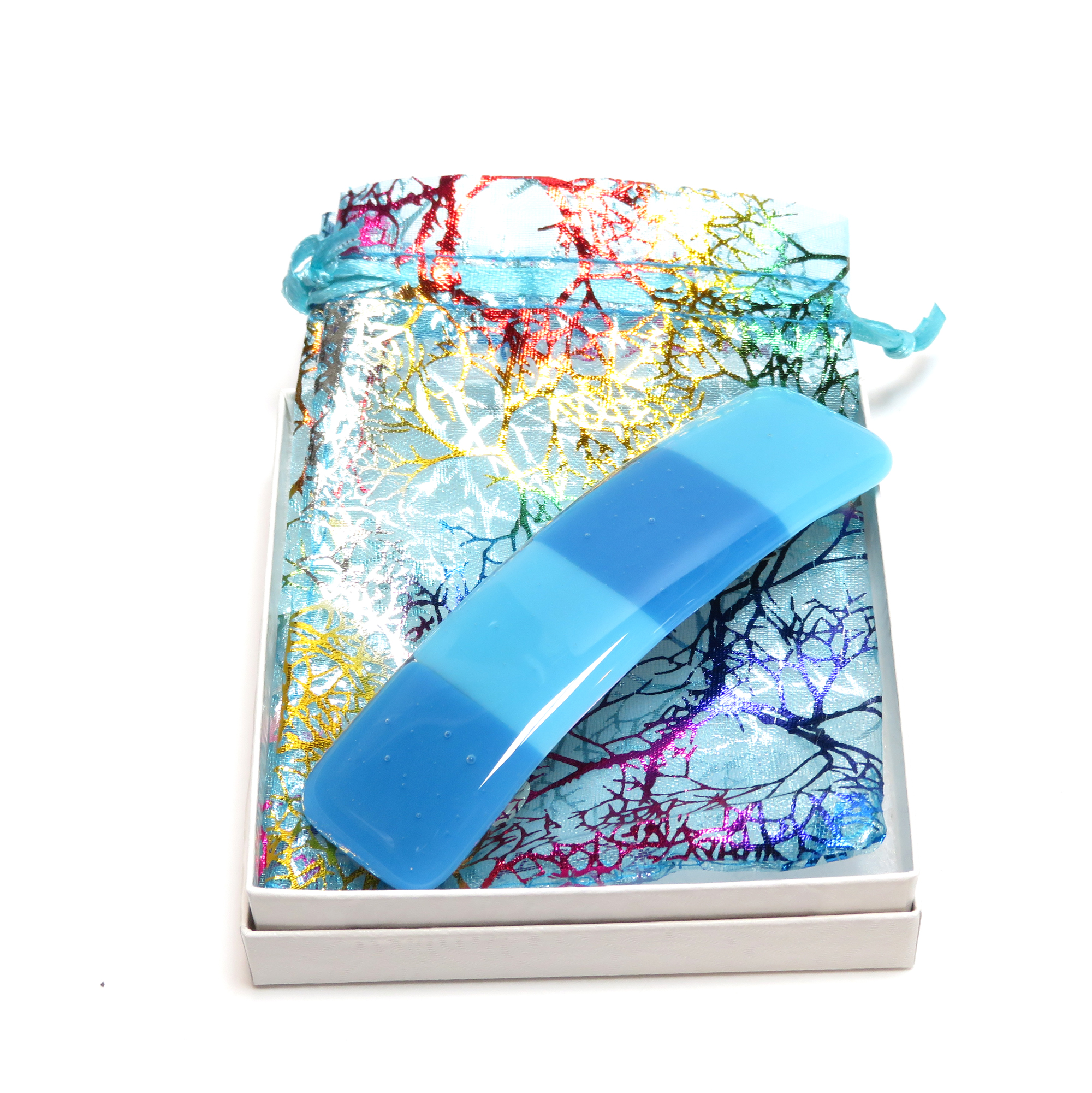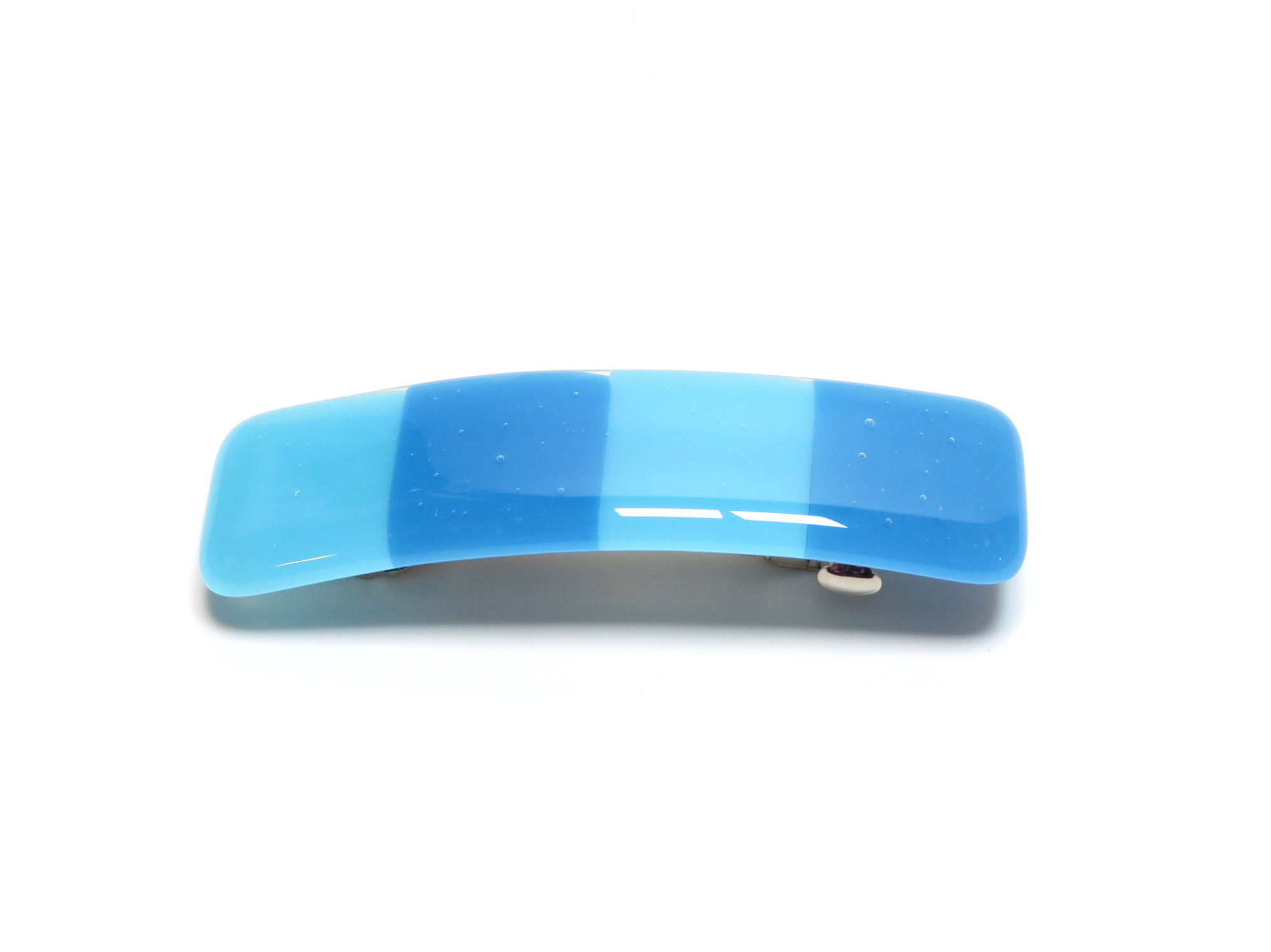This 4x1-inch fused glass barrette by Partners in Glass features soft gradients of aqua and sky blue — a refreshing, modern take on beach-inspired elegance. Each barrette is kiln-fired for over eight hours to achieve a luminous, glassy finish and lasting strength.