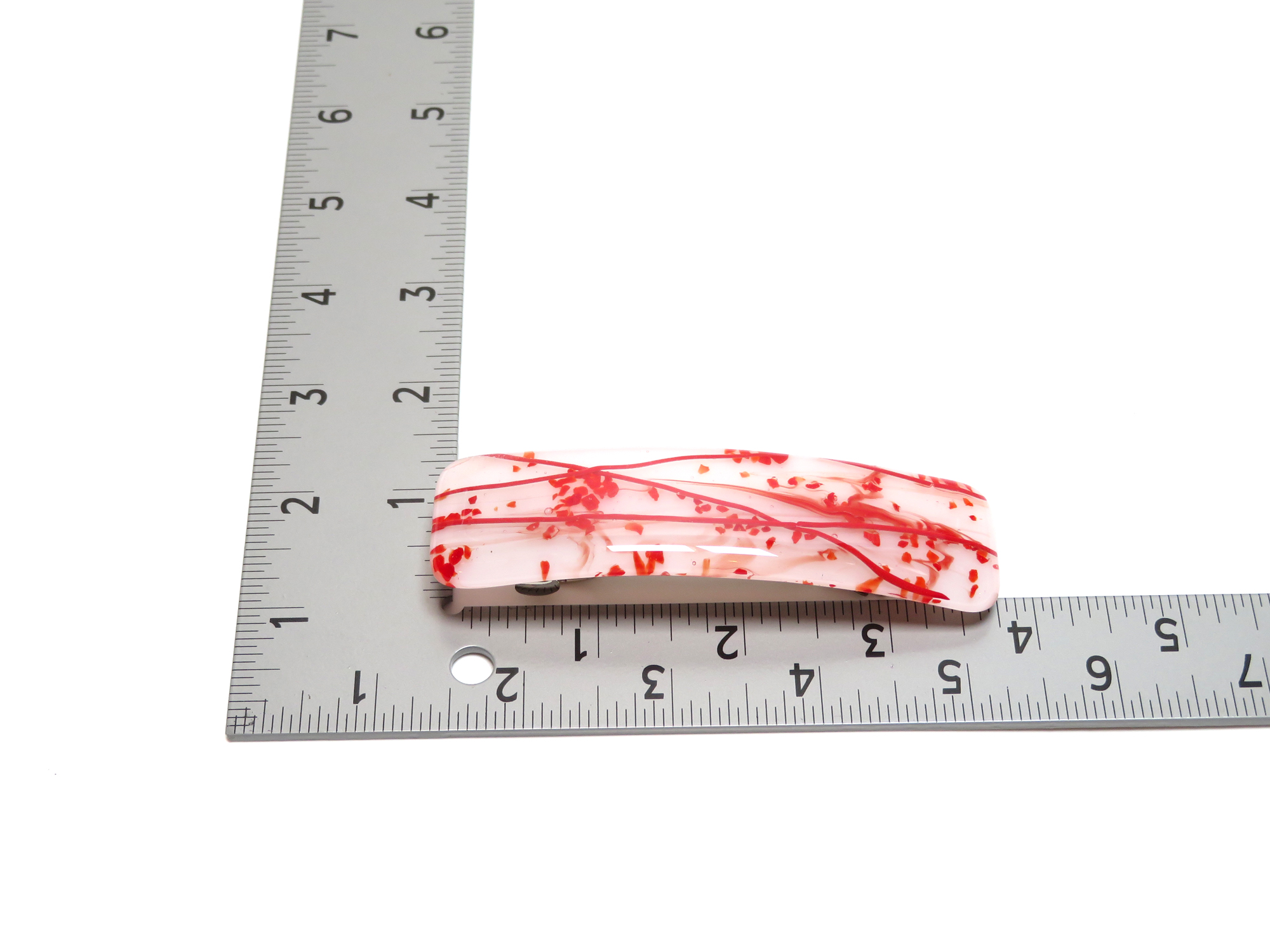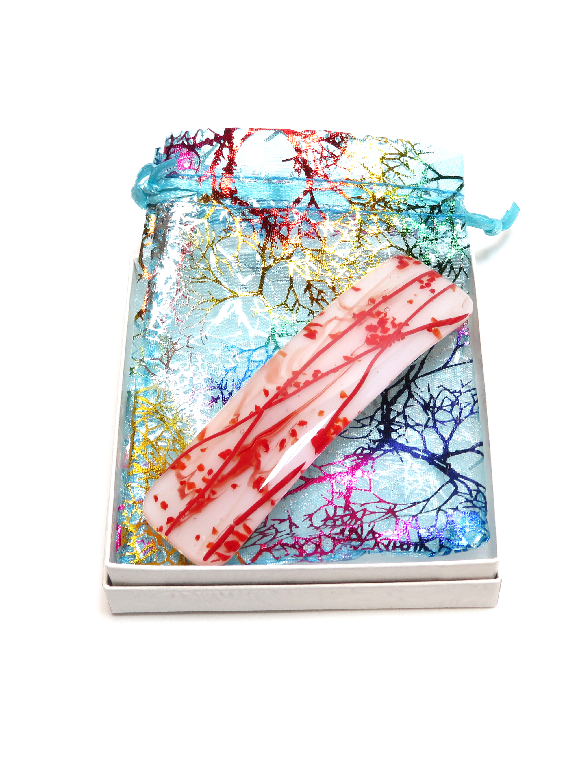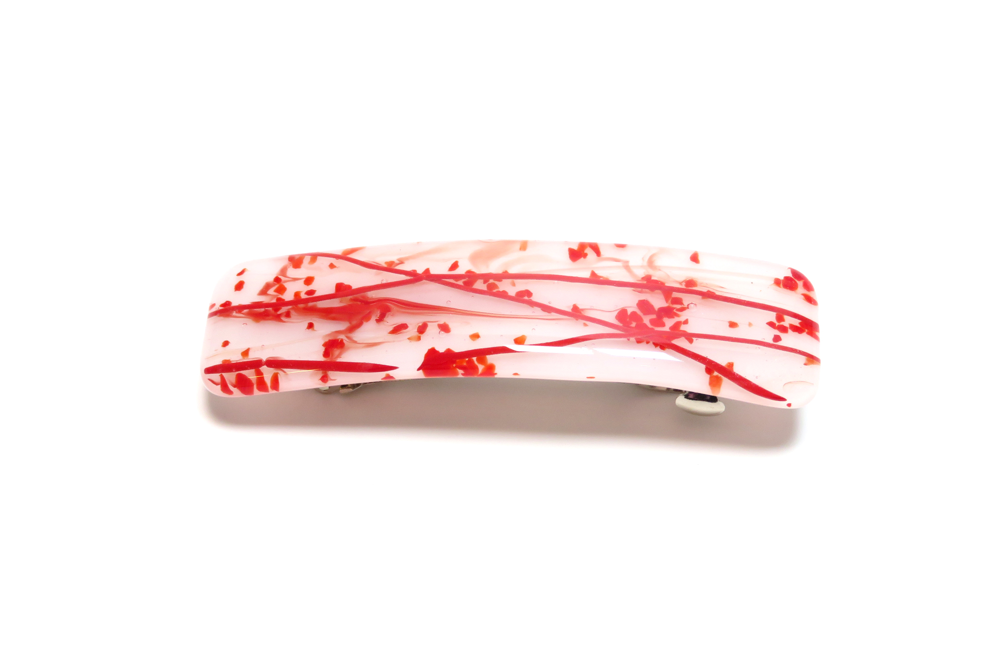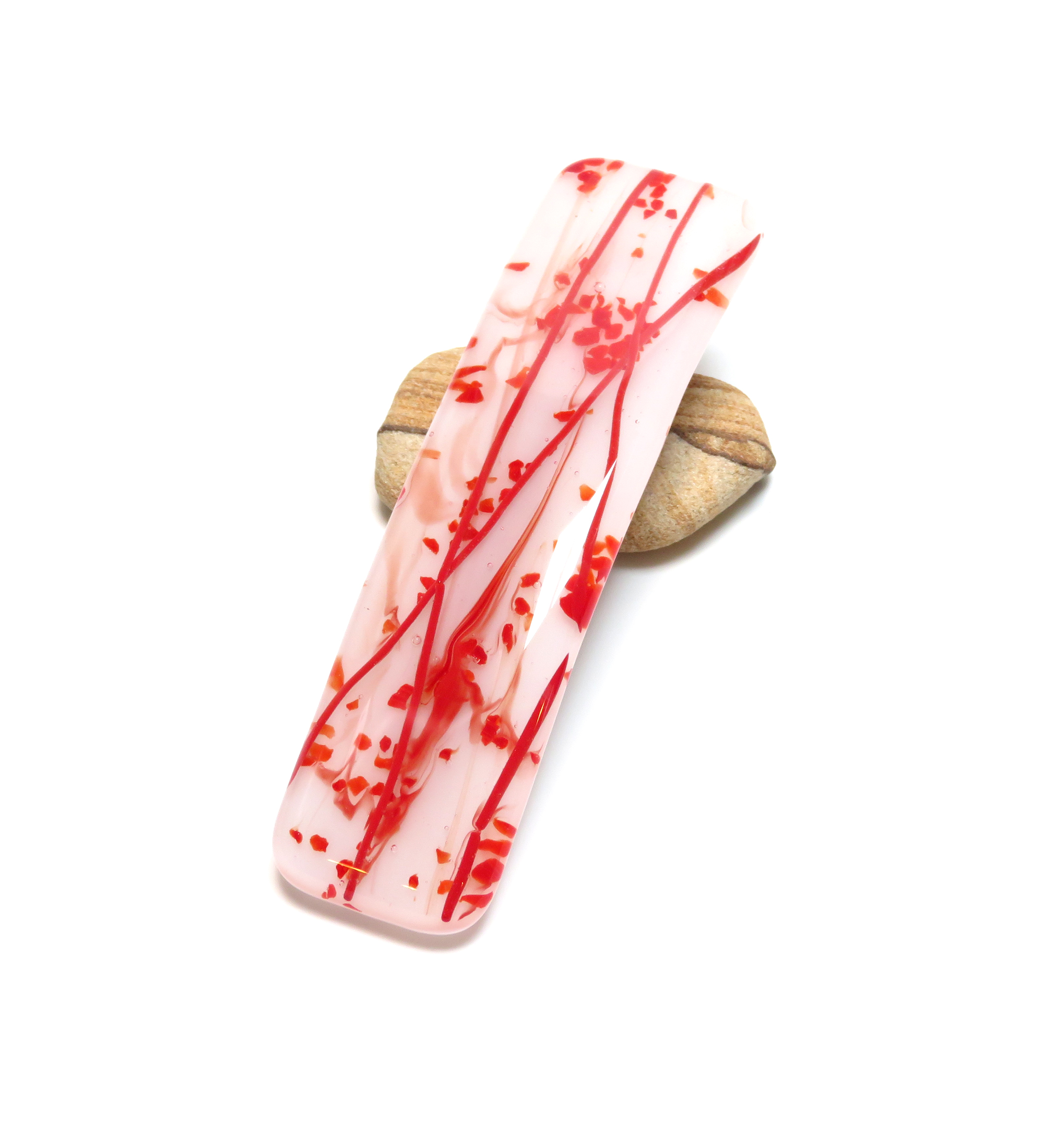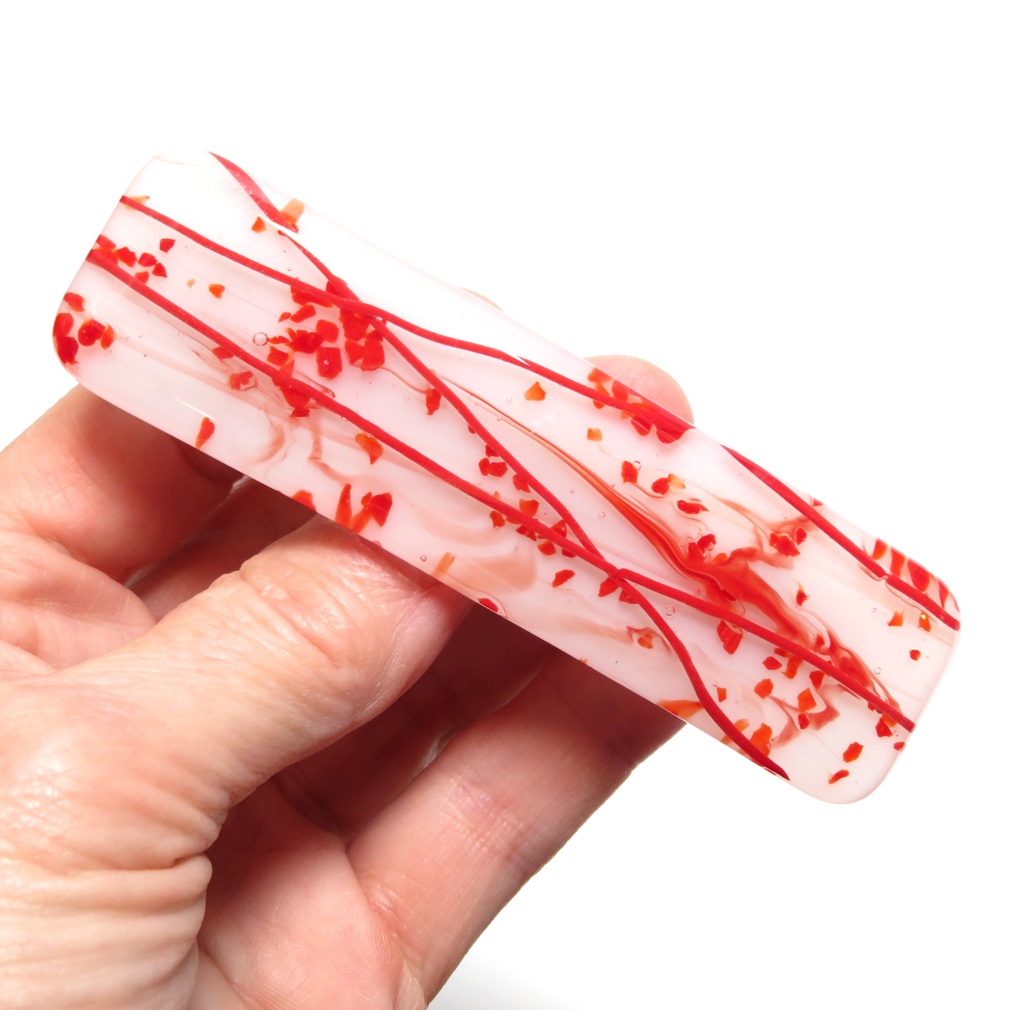 Add a bold, artistic statement to your hairstyle with this handcrafted fused glass French barrette, designed especially for thick or full hair. This 4-inch piece features vibrant red stringers and confetti-like glass accents floating in soft white—a striking look that feels modern, elegant, and completely unique.