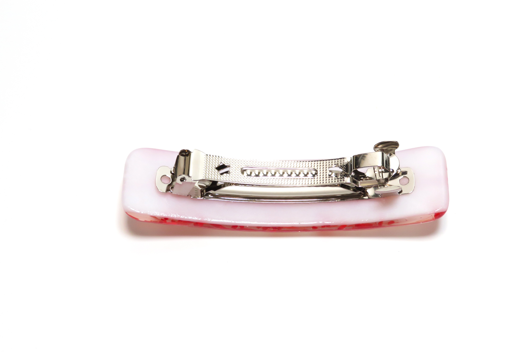 All pieces are original designs and carefully hand-cut, arranged, and fired in my kiln. Once fired, the edges of the barrette are cleaned up and returned to the kiln for a second firing to smooth out the edges and bring a final luster to the barrette. Finally, a French-style barrette clip is glued to the back of the barrette.