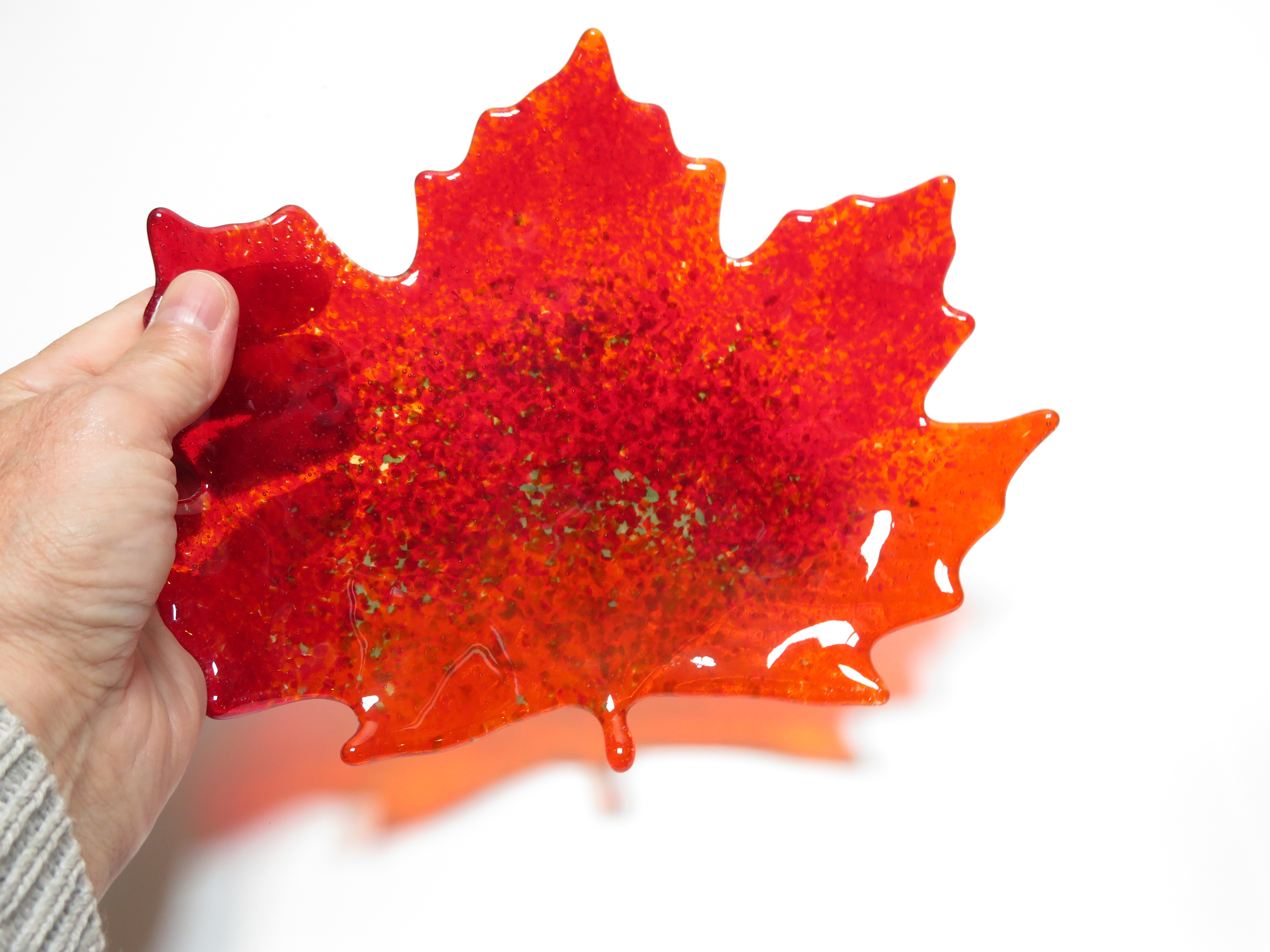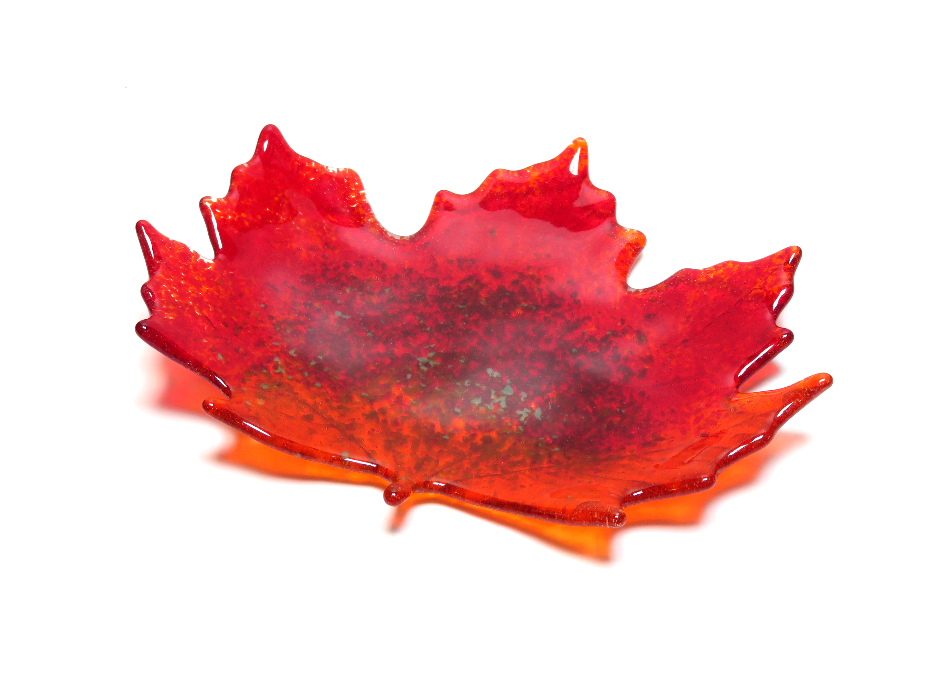 The leaf dish was made in a casting mold using crushed fusible glass and fired in a kiln for over 8 hours. It is then returned to the kiln for another 5 hours to be slumped which gives the dish a slight curve.