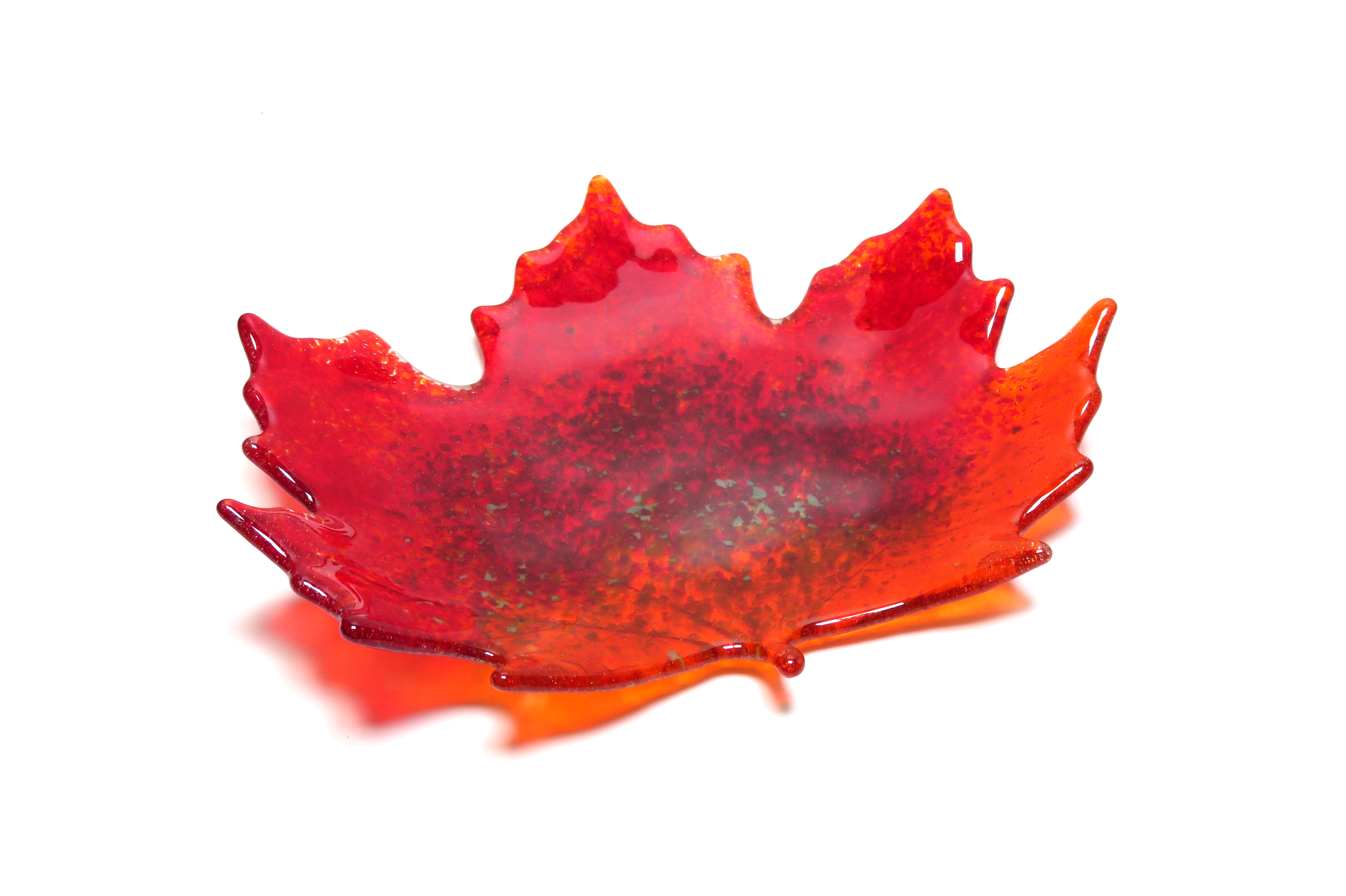 Bring the beauty of autumn indoors with this handcrafted fused glass maple leaf dish. Kiln-fired in rich shades of fiery red and orange, each piece captures the warmth and vibrance of fall foliage. Perfect as a decorative centerpiece, jewelry catch-all, candy dish, or seasonal gift, this glass leaf bowl is both functional and artistic.